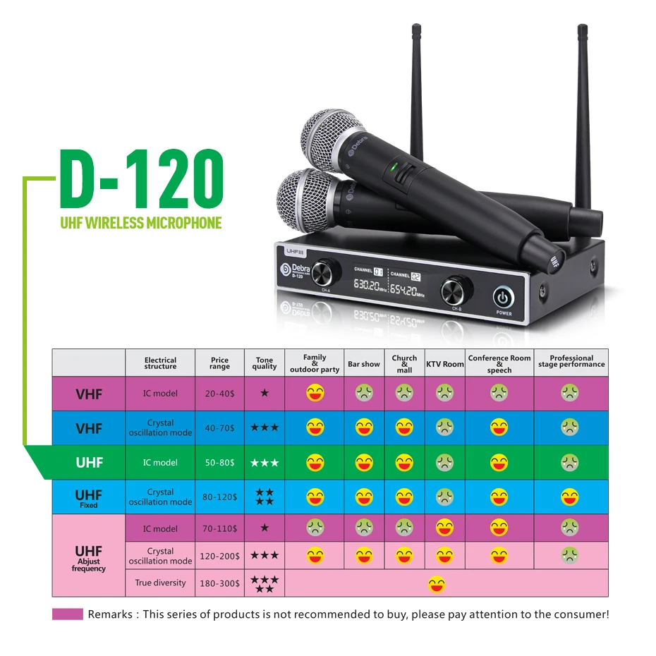 Дебра аудио D-120 UHF Беспроводная микрофонная система Двойные ручные микрофоны/двойные Lavalier & наушники микрофоны Костюм для всех видов выступлений, пения караоке, выступления в церковном домашнем классе Это высокого качества профессиональный и надежный 2 канала УВЧ беспроводной ручной микрофон системы. Он использует самые передовые технологии SMT (технология поверхностного монтажа) и изготовлен из высококачественных компонентов поверхностного монтажа для обеспечения его качества и надежности. Идеально подходит для профессионального представления, в церкви или караоке. Особенности системы: Диапазон несущей частоты: УВЧ 500 МГц-600 МГц Стабильность: + 0.005% Температура окружающей среды: -10 + 55 Максимальное отклонение: + 18 кГц | S/N радио: > 70 дБ Приседание: контроль тона и блокировка носа двойной скворч Частотная характеристика: от 80 Гц до 15 кГц Рабочий диапазон: 50 в открытой местности (около 160 футов) Контроль уровня шума: Блокировка шума Приемник Режим приема: кварцевый замок Чувствительность: 10 УФ (до 40 дБ SINAD/при 15 кГц отклонение) Аудио Ouput 0-350mV/5K Требования к питанию: 110 В/220 В переменного тока, 50 Гц Адаптер питания: 110-240 В, 50 Гц Передатчик: Микрофон: Динамический (ручной) Антенна: встроенная Модуляция: FM Стабильность частоты (+ 55 градусов C ~ - 10 градусов C): 0.005% (20ppm) Отклонение скорости: 75 кГц T.H.D при 1 кГц: менее 0.8% Соотношение сигнал/шум: 103 дБ Выход RF:<10 мВт Потребление тока: 30 мА Срок службы батареи: 9 часов (батарейки AA) [2 ручных микрофона] подходит для вашей руки: 1X Беспроводная микрофонная система 2x ручные микрофоны (батарейки в комплект не входят) 1X аудио кабель 1X зарядное устройство 1X Руководство пользователя [2 микрофона для боди] подходит для вашей руки: 1X Беспроводная микрофонная система 2x боди с (батарейки в комплект не входят) 2xLavalier Mic 2xHeadset Mic 1X аудио кабель 1X зарядное устройство 1X Руководство пользователя [1 Handhold 1 Bodypack Mic] подходит для вашей руки: 1X Беспроводная микрофонная система 1X ручные микрофоны (батарейки в комплект не входят) 1 шт. (батарейки в комплект не входят) 1xLavalier Mic 1xHeadset Mic 1X аудио кабель 1X зарядное устройство 1X Руководство пользователя