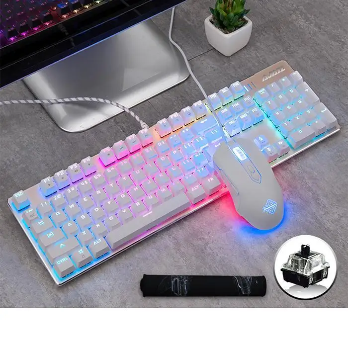 Материал: пластик 2 цвета: белое золото, черный Количество клавиш клавиатуры: 104 клавиши 2 типа: черная ось, зеленая ось Размер клавиатуры: 439x130x25 мм/17,3x5,1x1,0 дюймов Размер компьютерной мыши: 126x69x38 мм/5,0x2,7x1,5 дюймов Кол-во: 2 шт./компл. Главные особенности: Оптический Двигатель, точное позиционирование, быстрая реакция, скорость отклика кнопки Миллисекунда, крутая и красочная. Стильный внешний вид игровой структуры с нескользящим фланцем, который предназначен для вашего большого пальца, подходит для геймера. Эргономичный принцип, эффективно снимает усталость левой и правой руки. Кнопка подвески, механический вид, лазерная гравировка символов. Содержимое упаковки: 1 x клавиатура 1 x компьютерная мышь Примечание: Из-за разницы между различными мониторами изображение может не отражать фактический цвет изделия. Мы гарантируем, что стиль такой же, как показано на фотографиях. Спасибо за понимание.
