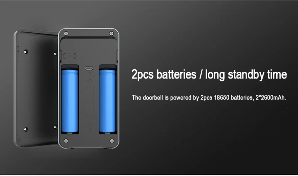 Дверной звонок питается от 2 батареек 18650, 2*2600 мАч. Время зарядки: 10 часов. Вы также можете использовать usb-зарядное устройство 1A (через дверной звонок микро-порт). Перед использованием полностью заряжайте аккумулятор 18650. Аккумулятор работает от двух до трех месяцев при нормальном использовании (пять минут в день). Это также зависит от частоты использования дверного звонка.