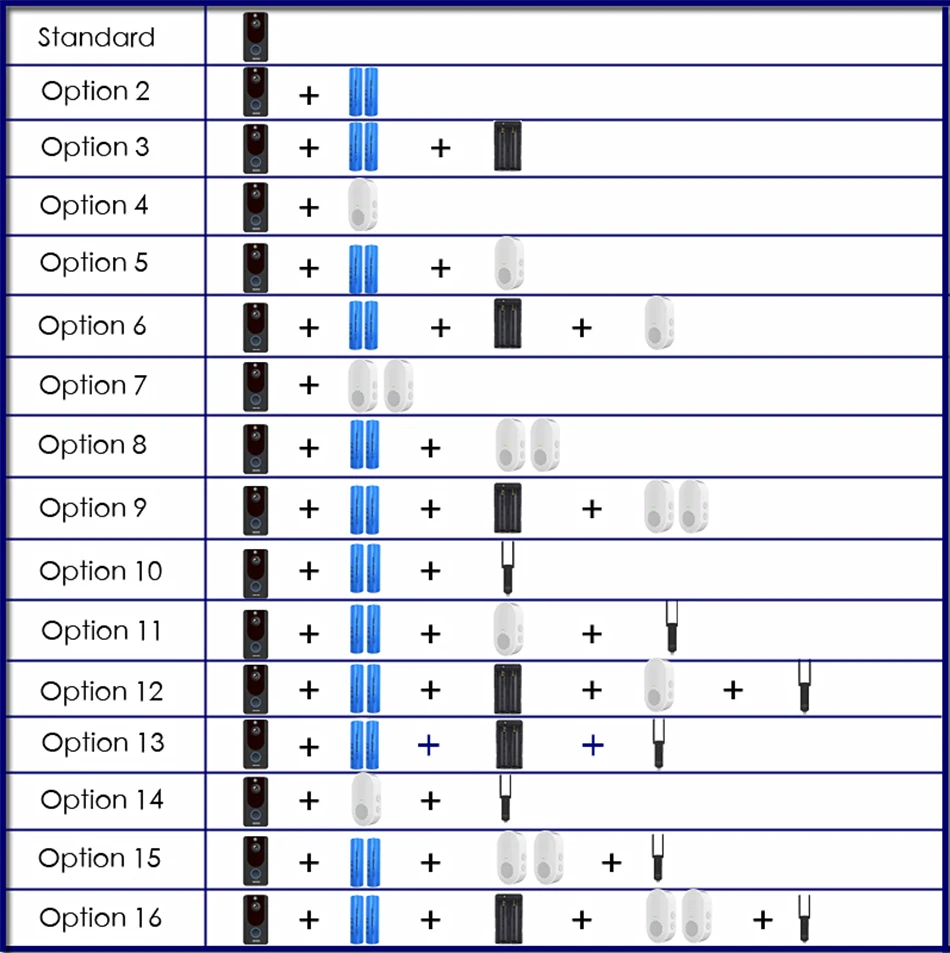 Стандарт: V7 Вариант 2: V7 + 2 * Аккумулятор Вариант 3: V7 + 2 * батарея + зарядное устройство Вариант 4: V7 + Chime Вариант 5: V7 + 2 * Батарея + Chime Вариант 6: V7 + 2 * батарея + зарядное устройство + Chime Вариант 7: V7 + 2 * Chime Вариант 8: V7 + 2 * Батарея + 2 * Chime Вариант 9: V7 + 2 * батарея + зарядное устройство + 2 * Chime Вариант 10:V7 + 2 * Батарея + Wifi удлинитель Вариант 11:V7 + 2 * Батарея + Chime + Wifi удлинитель Вариант 12: V7 + 2 * батарея + зарядное устройство + Chime + Wifi удлинитель Вариант 13: V7 + 2 * батарея + зарядное устройство + Wifi удлинитель Вариант 14: V7 + Chime + Wifi удлинитель Вариант 15: V7 + 2 * Батарея + 2 * Chime + Wifi удлинитель Вариант 16: V7 + 2 * батарея + зарядное устройство + 2 * Chime + Wifi удлинитель Если вы хотите купить оригинальный дверной звонок EKEN, пожалуйста, купите в нашем магазине, у нас есть Официальная Лицензия от EKEN.