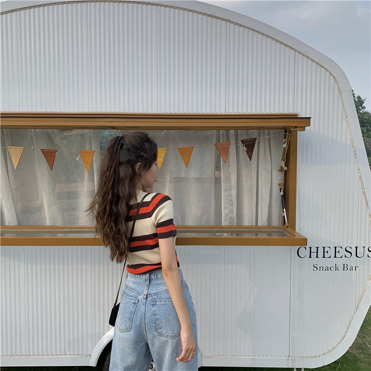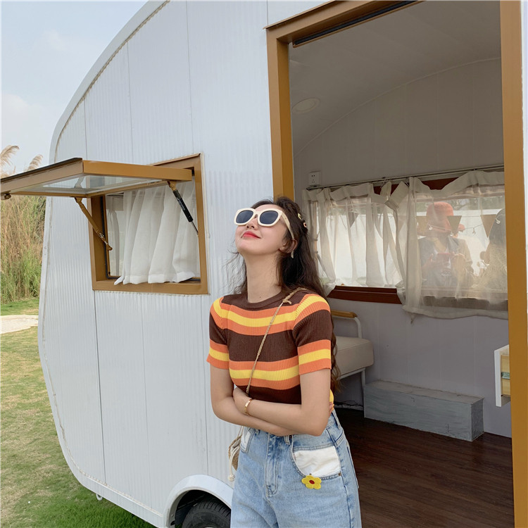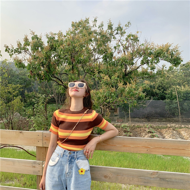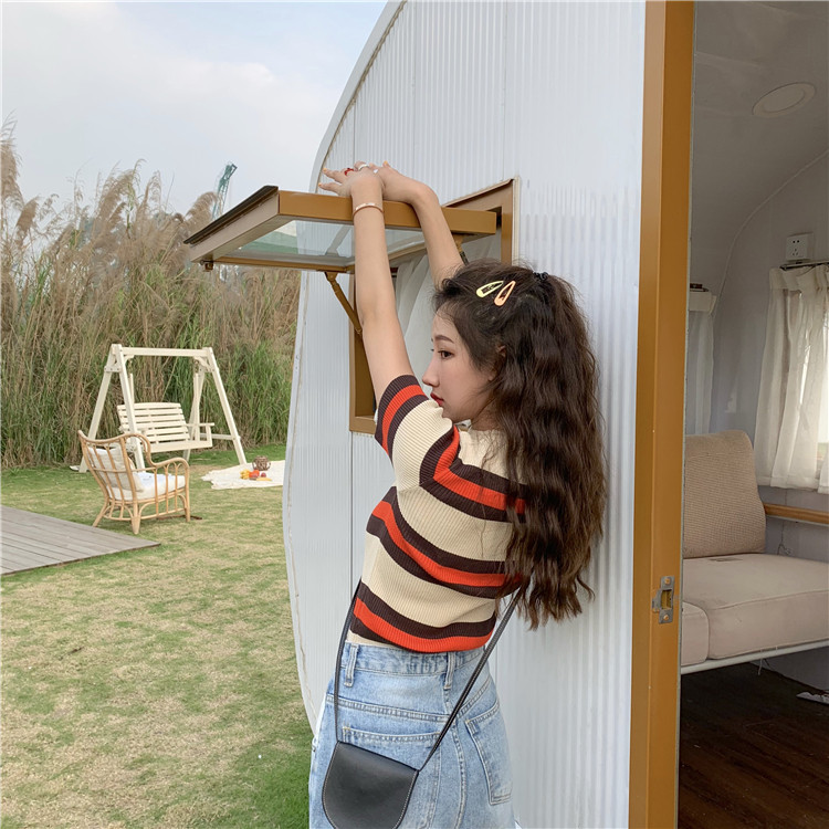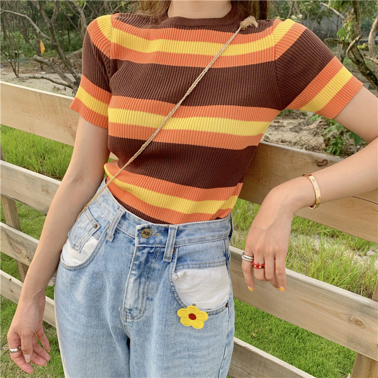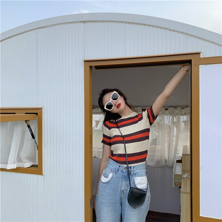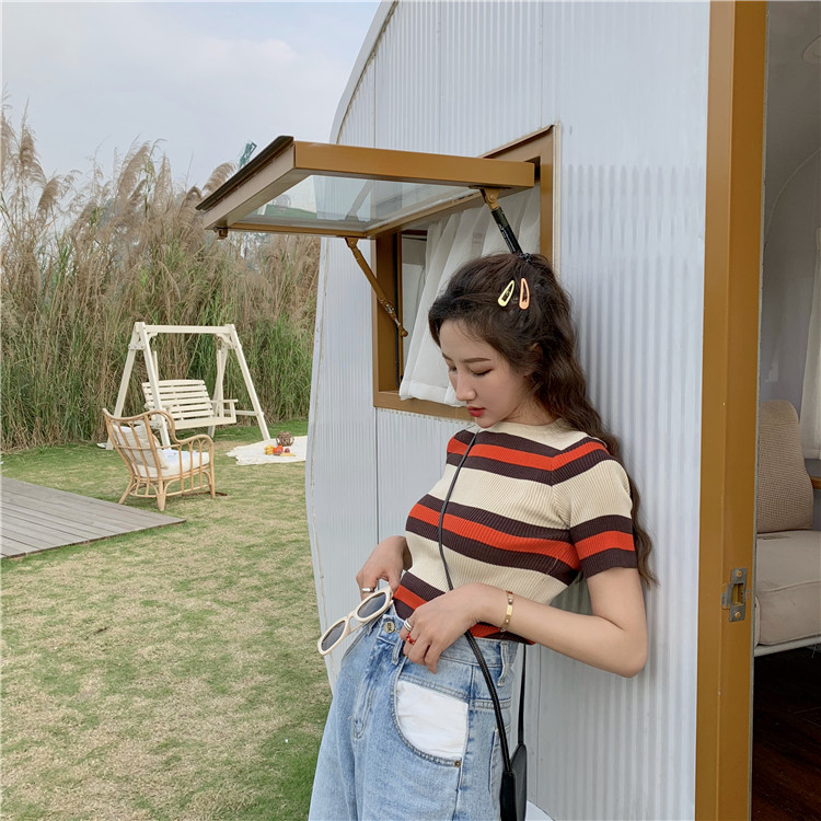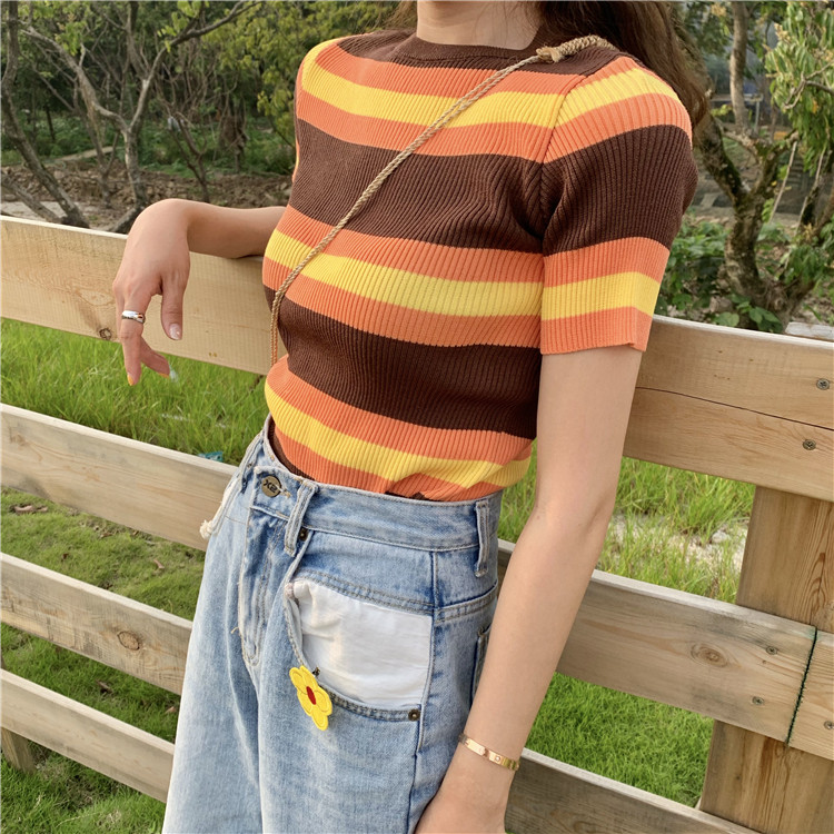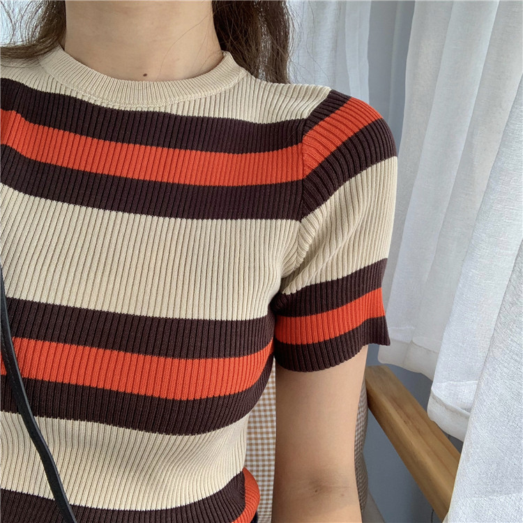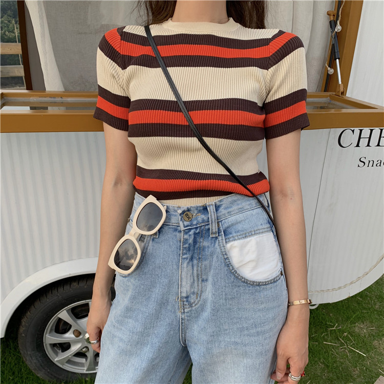 2 цвета 2019 летний корейский стиль полосатый свитер тонкий вязаный Топы Футболки с коротким рукавом женская футболка рубашка femme