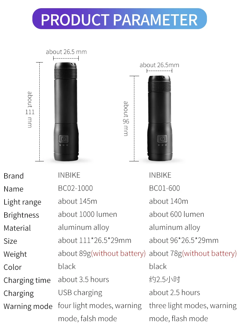 Бренд: INBIKE Номер товара: BC02-1000/BC02-600 Светильник диапазон: BC02 = 145 м/5708.6in BC01 = 140 м/5511.8in Яркость: BC02 = 1000 люмен (бесплатное обновление от 760 люмен до 1000 люмен) BC01 = 600 люмен Материал: алюминиевый сплав Вес: BC02 = около 89 г (без аккумулятора) BC01 = около 78 г (без аккумулятора) Цвет: черный, черный Время работы на одном заряде: BC02 = около 3,5 часов BC01 = около 2,5 часов Зарядка: USB зарядка Предупреждение режим: четыре светильник режимов, Предупреждение три светильник режимов, Предупреждение режим, режим вспышки режим, флэш режиме