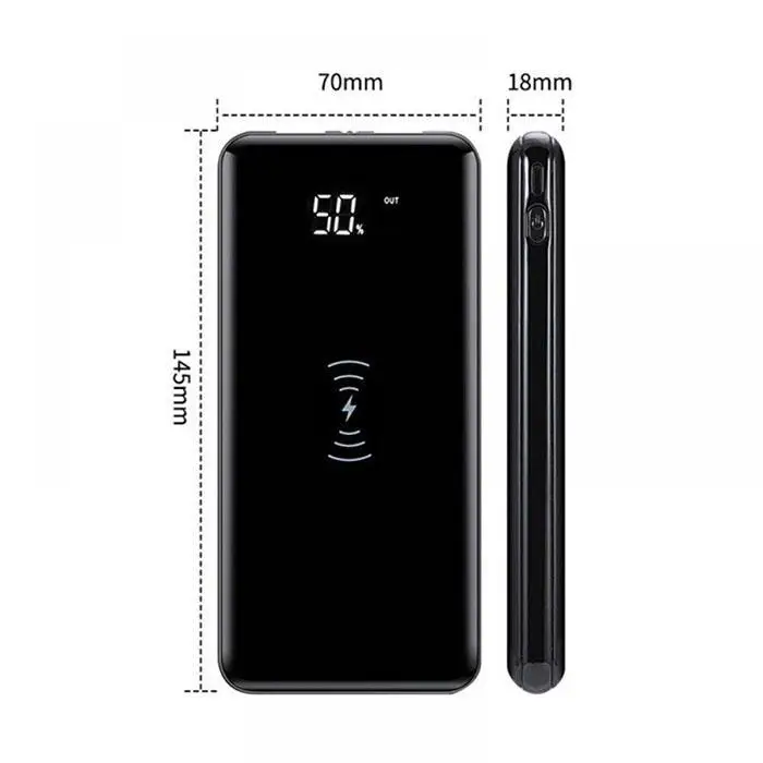 Material: ABS Color: As Picture Package Size: 14 x 6 x 1cm/5.5 x 2.4 x 0.4inch Product Type: Wireless Charging Power Bank Design: Dual USB Ports, LED Flashlight Function: Charging, Battery Indicator Display: Full Screen LCD Digital Display Input: Micro USB Sensing Distance: 6mm Output 1: 5V/1A Input: 2A Quantity: 1pcs Features: Fast charging, plug and charge. Portable and lightweight, easy to carry. Suitable for general USB devices charging use. Package Content: 1 x Wireless Charging Power Bank Note: Due to the difference between different monitors, the picture may not reflect the actual color of the item