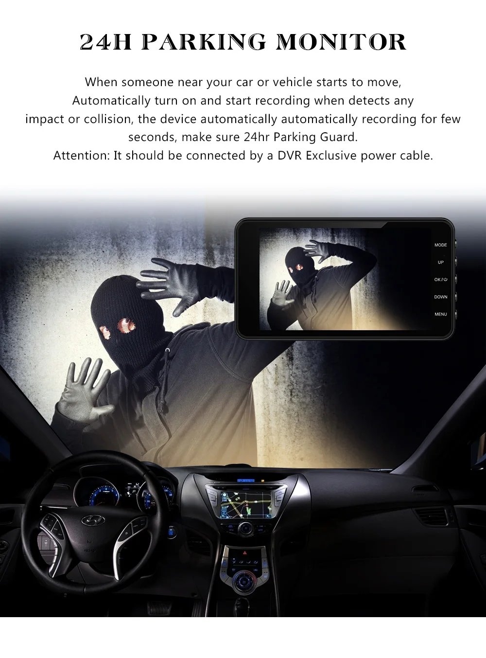Когда кто-то рядом с вашим автомобилем или транспортным средством начинает двигаться, автоматически включается и начинает запись при обнаружении любого воздействия или столкновения, устройство автоматически записывает в течение нескольких секунд, убедитесь, что 24Hr парковка охраняет. Внимание: он должен быть подключен эксклюзивным кабелем питания DVR.