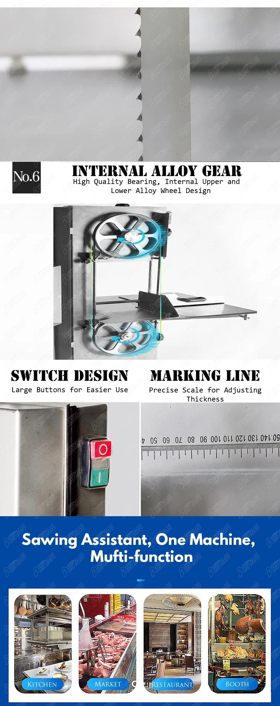 1.Stainless Steel Body:The body is made of high quality stainless steel 2.Stainless Steel worktops:Made of Stainless Steel to Increase Hardness and Ensure Machine Efficiency 3. Residue Tray:Sawdust will fall into it. So it’s easy to clean 4. Elastic adjustment Device:The saw blade can be elastically adjusted ,so it is more convenient to operate 5.Imported Saw Blade:The saw edge is sharp and uniform, improving the efficiency of bone cutting 6. Internal Alloy Gear:High Quality Bearing, Internal Upper and Lower Alloy Wheel Design 7.Switch Design:Large Buttons for Easier Use 8.Marking Line: Precise Scale for Adjusting Thickness