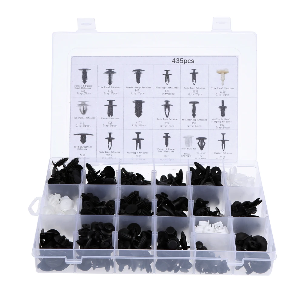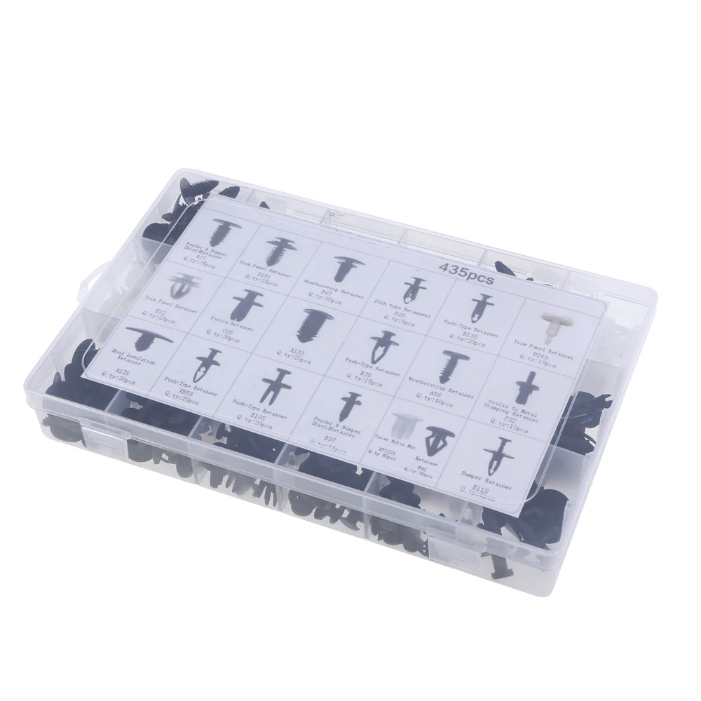 Ассорти формовочный набор зажимов, включает в себя различные типы, чтобы удовлетворить ваши требования. Все булавки и заклепки хранятся в коробке с небольшим отсеком, который вы можете легко выбрать и собрать. Он обычно используется для ремонта боковых юбок, бамперов и другой отделки.