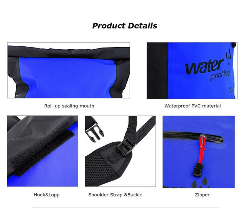 1. Материал: водонепроницаемый ПВХ 2. Размеры (высота x Ширина) :46 см x 32 см/18 дюймов x 12,6 дюймов 3. Емкость: 25 л