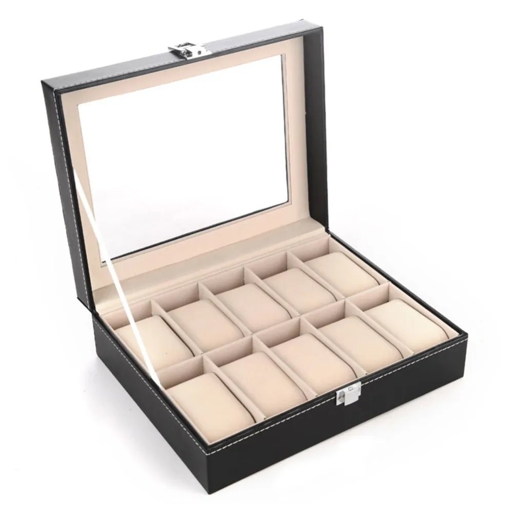 Кожаная Коробка для часов отлично подходит для личного использования, Витрины Магазина и украшения дома. Отличный способ не только показать ваши ювелирные изделия, но и сэкономить время утром. Верх из настоящего стекла обеспечивает вам лучший обзор, чтобы выбрать ваши любимые ювелирные изделия. Крышка имеет металлическую петлю, чтобы она не падала обратно. Металлический замок с ключами гарантирует безопасность. Это хорошая витрина и хорошо работает, чтобы ваши часы, ожерелья, браслеты, кольца, серьги были безопасными и организованными. Хорошая идея подарка для девочек, мальчиков, женщин и мужчин.