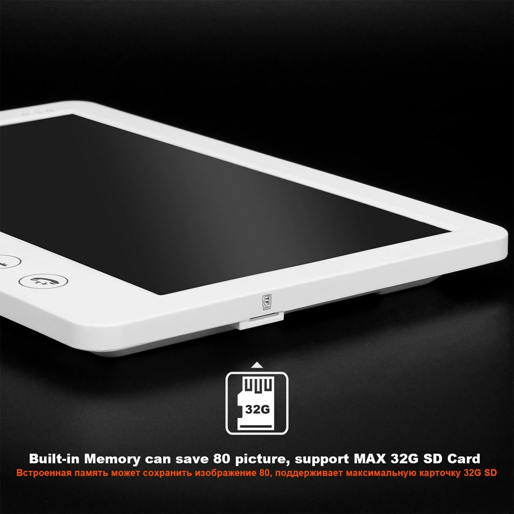 Монитор: 10,1 "широкоцветный HD TFT lcd, 1024*600 Память: встроенная память может экономить 86 фотографий, поддерживает внешнюю карту Max.32GB SD Домофон Код: Hands-free двухстороннюю Связь Задержка вызова: 120 s Клавиатура: сенсорная кнопка Вход и потребление питания: внешняя мощность 12 В постоянного тока; Режим ожидания: 3 Вт; работа: 5 Вт Материал: акриловая рояльная Лаковая оболочка Запись: Изображение: формат Jpeg; Vide: Формат Avi Поддержка: 2 панели вызова + 4 внутреннего монитора + 2 аналоговых камеры и 2 PIR Рабочая температура:-10 градусов + 60 градусов Установка: Поверхностный монтаж