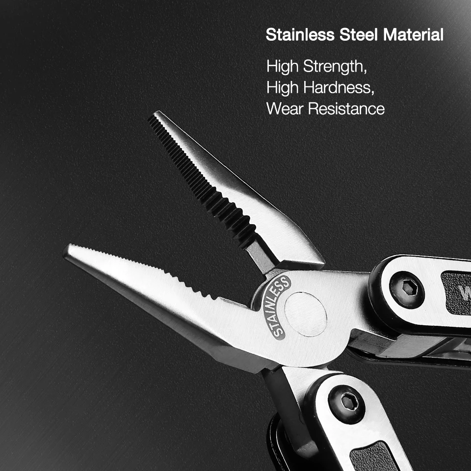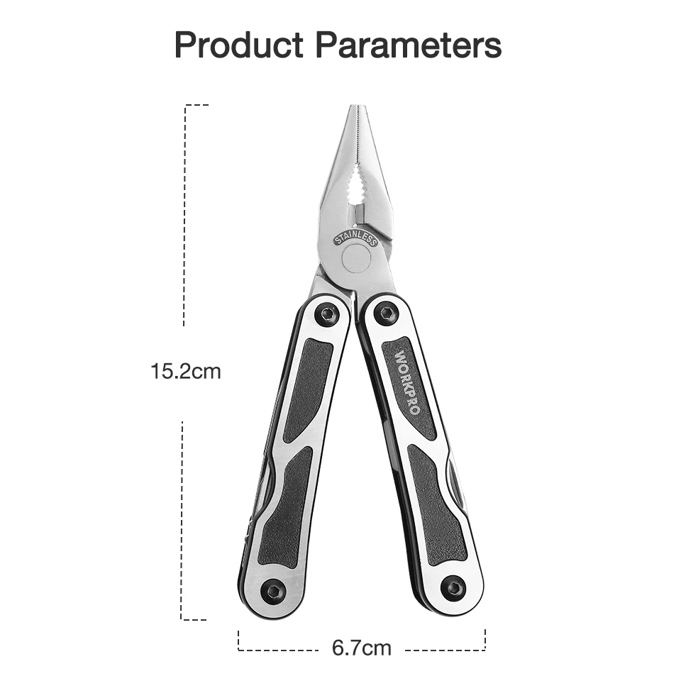 * Точность перфорированные, котор подвергли механической обработке поверхности * Компоненты из нержавеющей стали * Компактный складной дизайн * Идеальным выбором для общего назначения использования * Содержит: 1 шт. нейлоновая повязка; 1 шт. 15-в-1 многофункциональные плоскогубцы * Плоскогубцы размер: длина 15 см открывается и закрывается длина 9,4 см • Размер сумки: 12 см x 6,3 см x 3 см