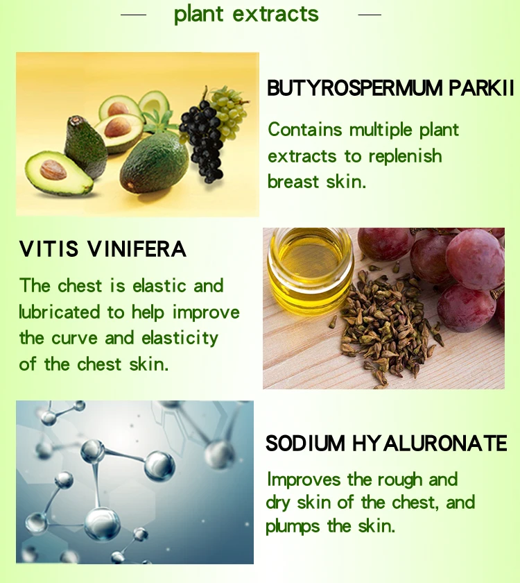 Содержит эссенцию авокадо, жожоба, колбасных фруктов, хмеля и других множества растений, чтобы добавить питательные вещества для кожи груди, слои питания, придать груди эластичность и смазку. Помогает улучшить изгиб и эластичность кожи груди, улучшает грубую и сухую кожу груди,