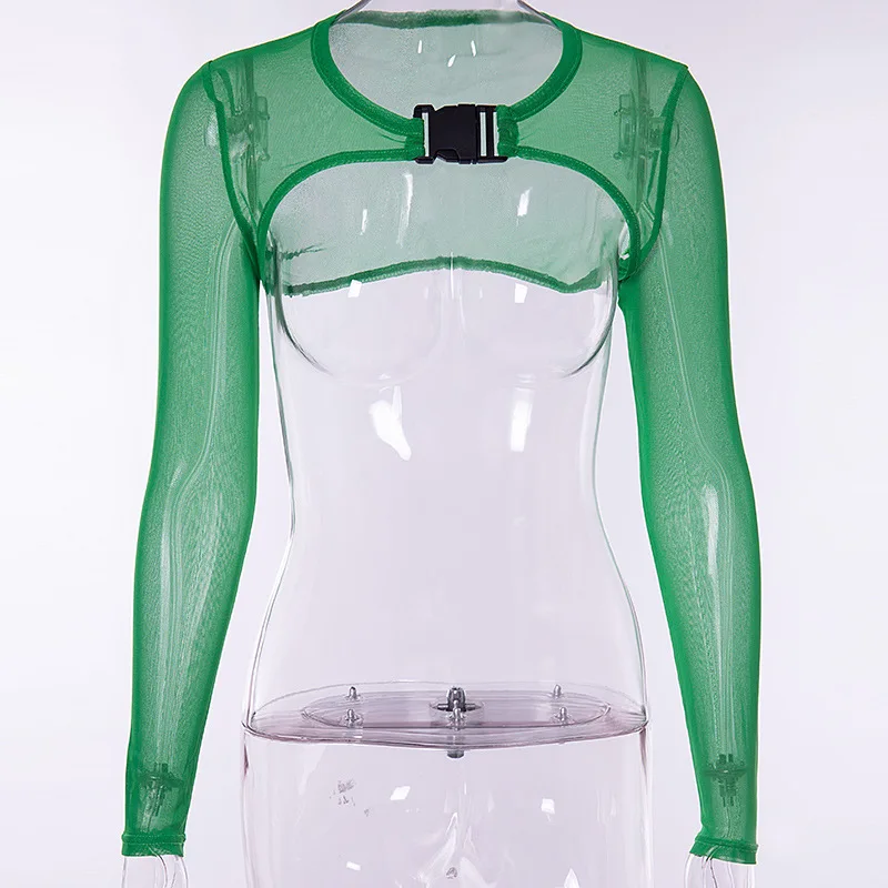 Повседневная Женская Сексуальная укороченная блузка с длинным рукавом, с пряжкой и круглым вырезом, Прозрачная женская блузка, летняя одежда, новинка, GRNSHTS
