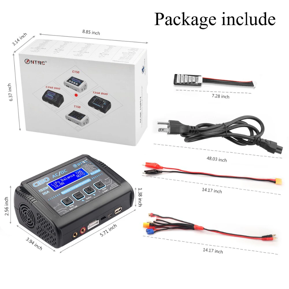 C150 is a new design multi-functional high power balance charger by HTRC,economic price,high quality.Utilizing 2x16 LED display,built-in cooling fan,DC 11-18V or AC 100-240V dual power.Max charger power 150w,Max charge current 10A.Designed for charging LiPo LiFe Lilon LiHV NiCd NiMh Pb Smart Batteries.
