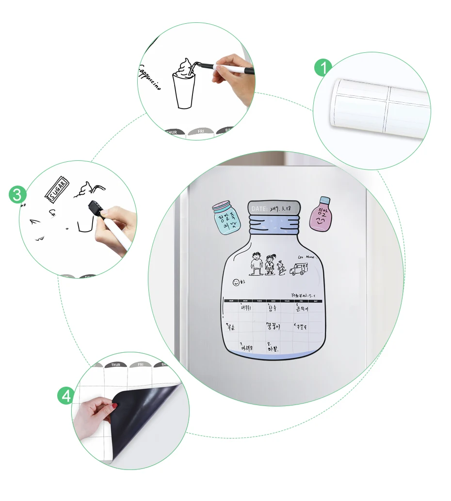 1. Мягкий, гибкий и водонепроницаемый Может быть свернут и портативный. 2. Хорошо подходит для письма С обычным маркером для белой доски. 3. Сухая салфетка Импортированная ПЭТ пленка, может быть вытерта даже через 30 дней 4. Само-магнитный ПЭТ поверхность + резиновая Магнитная Задняя сторона. Само-магнитный для поверхности черных металлов, как холодильник