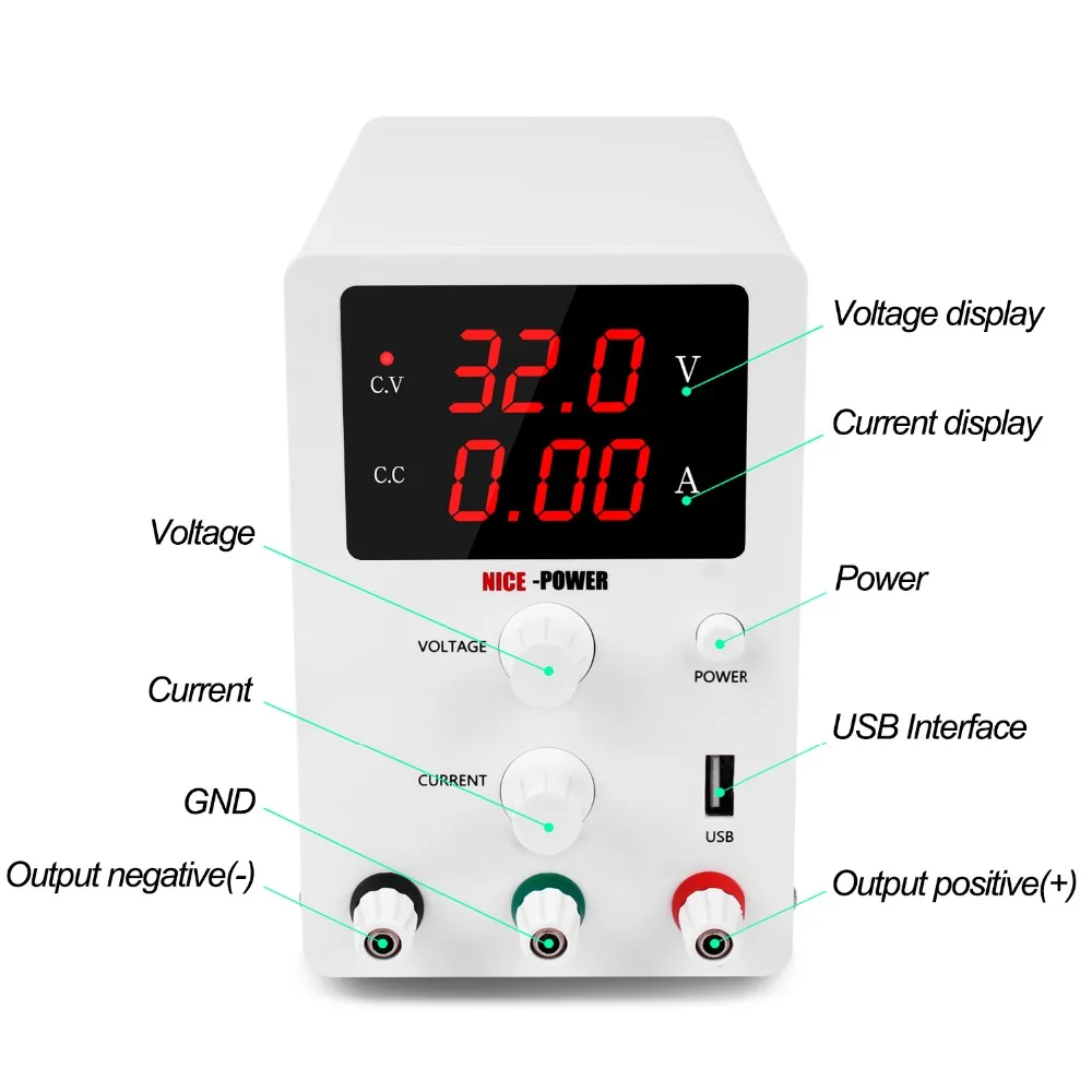 Входное напряжение: 115 В переменного тока, 60 Гц (США)/230 В, 50 Гц (ЕС) Переключатель настройки напряжения находится сзади. Выходное напряжение: 0 ~ 30 в Выходной ток: 0 ~ 5A/10A (опционально) Тип вилки: США/ЕС/Великобритания/Австралия (опционально) Напряжение: 0,1 в В настоящее время Разрешение: 0.01A Напряжение пульсации: Vpp≤1 % Эффект мощности: CV≤1 % + 10 мВ Эффект нагрузки: CV≤1 % + 10мв Цифровой Дисплей: 3 светодиодный цифровой дисплей Шум пульсации: ≤1 мВ Точность отображения напряжения: ± 1% + 1 цифра Точность отображения тока: ± 1% + 2 цифры Рабочая среда:-10 ~ 45 градусов/14 ~ 113 по Фаренгейту Rh≤90 % Среда хранения:-20 ~ 60 градусов/-4 ~ 140 по Фаренгейту Rh≤80 % Размер изделия: прибл. 80*230*165 мм/3,1*9,1 * 6.5in Вес изделия: прибл. 1448,4 гр/51,1 унций Посылка: прибл. 28,5*11,5*20 см/11,2*4,5 * 7.9in Посылка: прибл. 1833 гр/64,6 унций