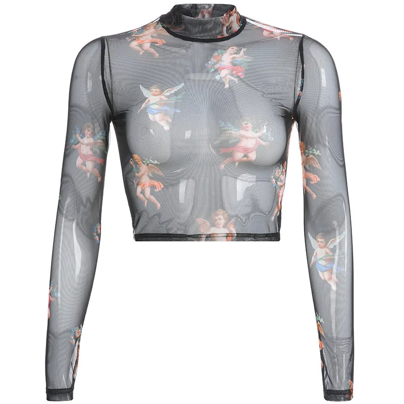 Женская Прозрачная Футболка с высоким воротом Angel, базовая обтягивающая футболка с длинным рукавом и принтом