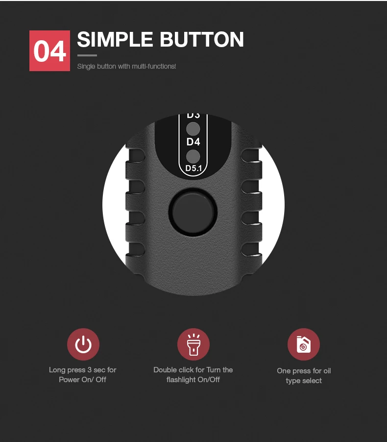 2. ЖК-дисплей отображает результат тестирования, чтобы сказать вам качество тормозной жидкости.Для DOT3: ниже 1% высокой чистотыДо DOT4: статус ниже 2% допустимДля DOT5: более 4% нужно заменить Советы:Для обеспечения хорошей эффективности торможения рекомендуется измерять масло Индекс, чтобы достичь диапазона 23, пожалуйста, измените тормозной oll вовремя, чтобы защитить вашу безопасность drlving.![]()