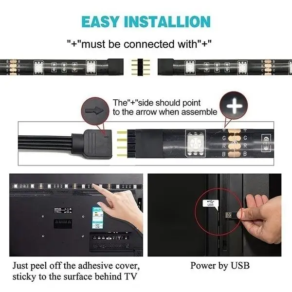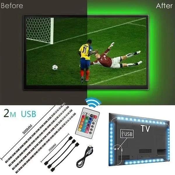 Особенности: Супер яркий SMD 5050 RGB цвет с 24-клавишным RGB ИК-пультом дистанционного управления. Защита от влаги гибкий светодиодный полосы, отлично подходит для украшения в помещении и на открытом воздухе. Настройка DIY украшения для телевизора или ПК монитора фонового освещения. Также можно использовать для украшения потолка, шкафа, кухни, гостиной, гостиничного номера и т. Д. Просто подключите и играйте, питание от usb-порта 5 В, можно подключить к телевизору, ПК, powerbank, автомобильному прикуривателю и т. Д. Просто вставьте светодиодный полоски на задней части вашего ТВ и подключите их ленты инструменты для наращивания волос.