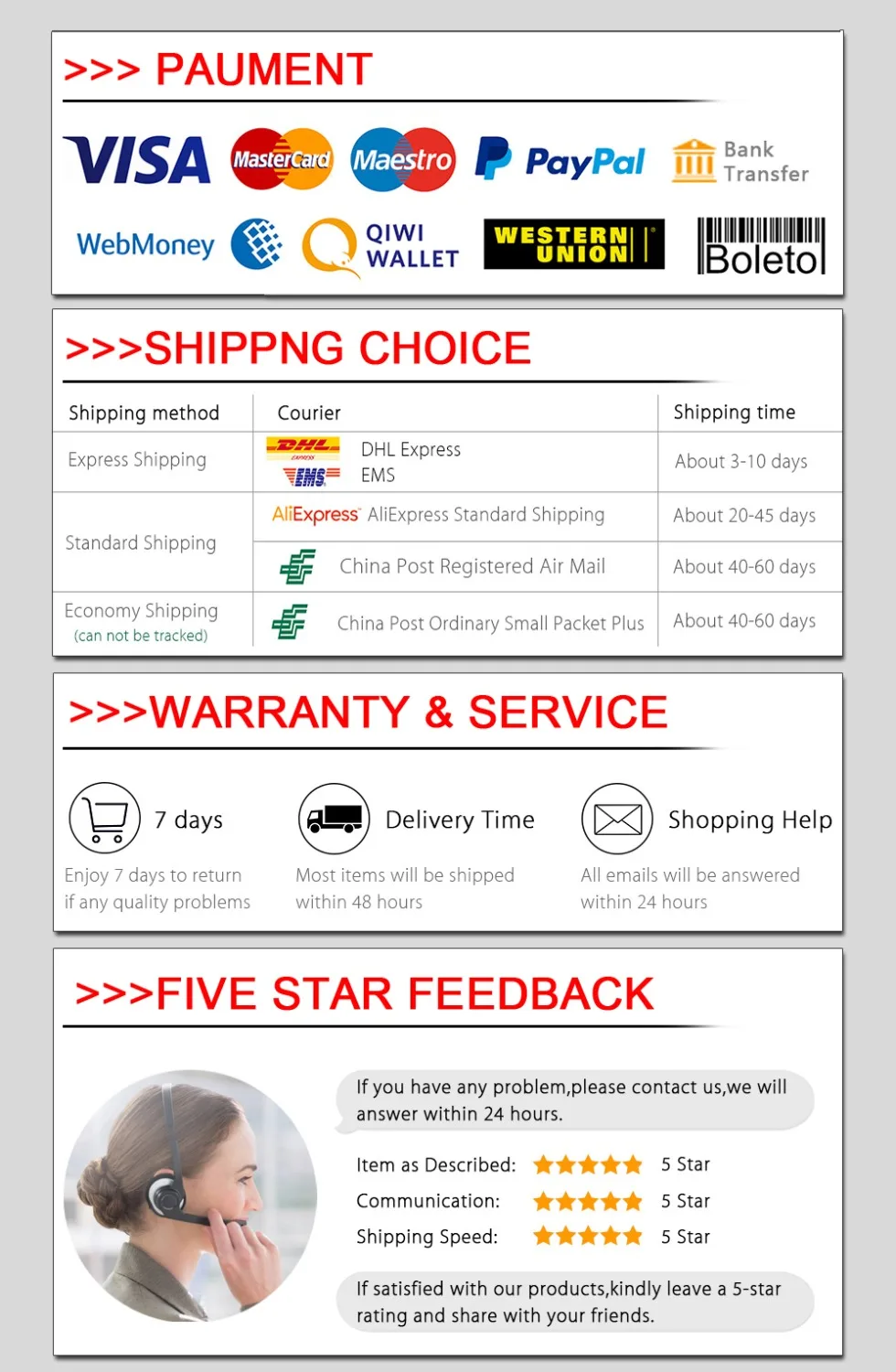 Дорогие друзья! Большое спасибо за посещение нашего магазина! Мы сделаем все возможное, чтобы служить вам! Если у вас есть какие-либо вопросы, пожалуйста, свяжитесь с нами для решения, не открывайте споры, споры-это просто пустая трата времени. Спасибо О Senting 1: не беспокойтесь о скорости доставки, товары нашего магазина есть в наличии! После того, как вы разместите заказ, мы организуем доставку вовремя! 2: вы можете выбрать свой собственный способ доставки! Если у вас нет особых требований, мы можем выбрать самый быстрый способ доставки! 3: перед отправкой, мы проверим ваш адрес, если ваш адрес принадлежит удаленной области, мы свяжемся с вами! 4: наши товары не включены в цену таможенных пошлин и удаленных расходов на доставку О таможенных сборах: 1: после того, как мы отправим товары, как правило, около 7 дней, чтобы добраться до таможни! Своевременно решать таможенные вопросы! 2: Если вам нужен счет-фактура, пожалуйста, оставьте мне сообщение и оставьте свой адрес электронной почты, я отправлю в ваш почтовый ящик в течение 8 часов! 3: наши продукты не включают таможенные пошлины. Если таможня вашей страны берет таможенные пошлины, пожалуйста, оплатите вовремя. Мы не несем ответственности, если товары возвращены или уничтожены, потому что нет своевременной оплаты таможенных пошлин. Спасибо за понимание.