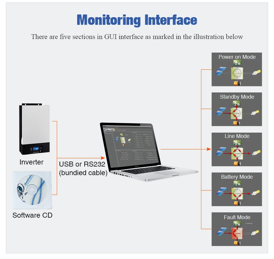 Автономный инверторный режим работы: Подключите солнечные панели для питания к нагрузке и зарядите аккумулятор одновременно; Вы можете использовать сетку или батарею для питания к нагрузке; но не может питать электроэнергию в сетку; PV + аккумулятор обеспечивает питание к нагрузке. Когда энергия недостаточна, она автоматически переключается в режим обхода.