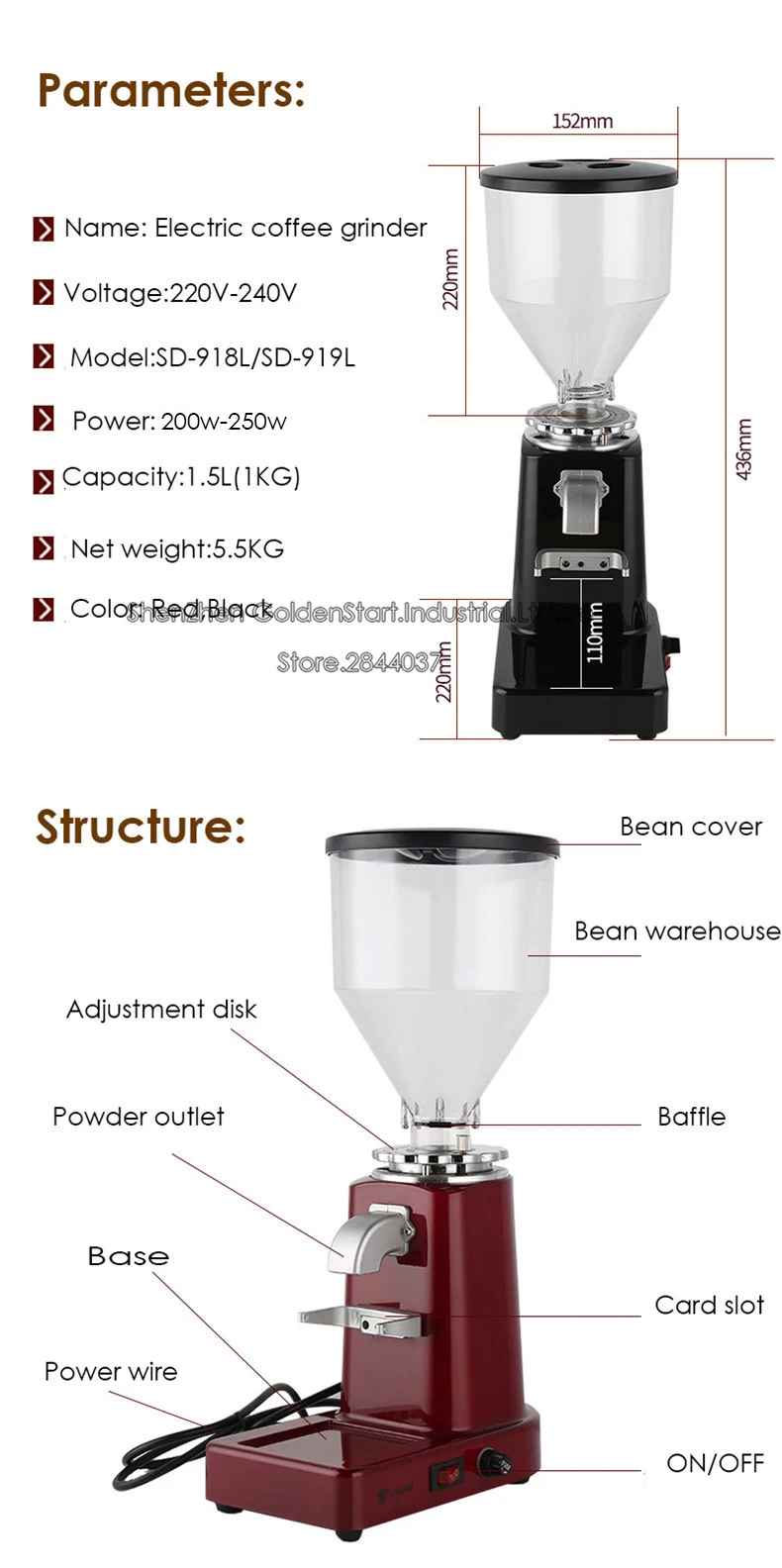 Параллельные конусные заусенцы, быстрая, стабильная, быстрая шлифовка, емкость 1 кг бобов, емкость 110 чашек кофейного порошка, попрощайтесь с повторным добавлением бобов. Машина имеет дизайн предохранителя и запасной предохранитель на дне для легкой замены.