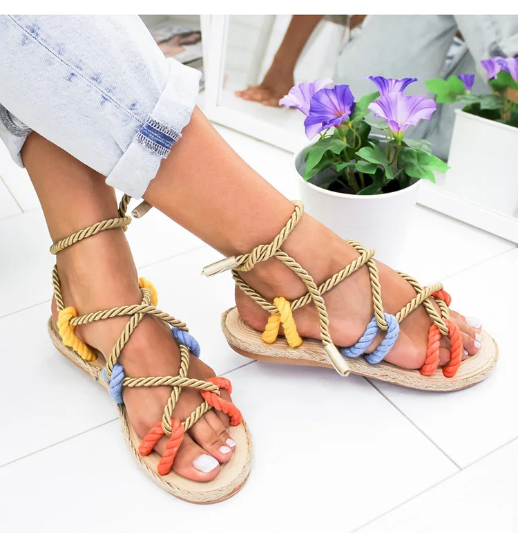 Женские сандалии-гладиаторы с перекрестной шнуровкой, римские сандалии с пеньковой веревкой, 2019
