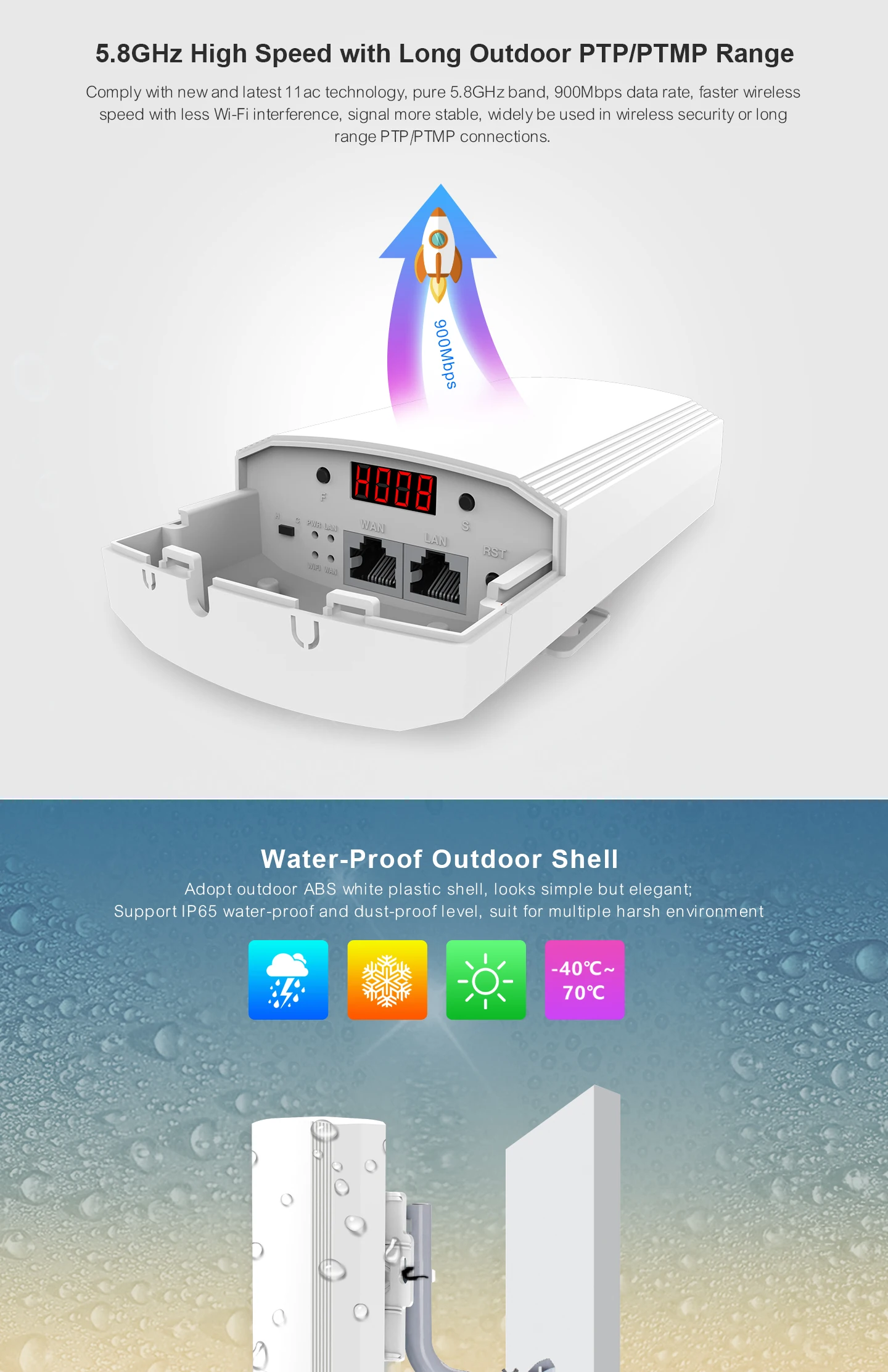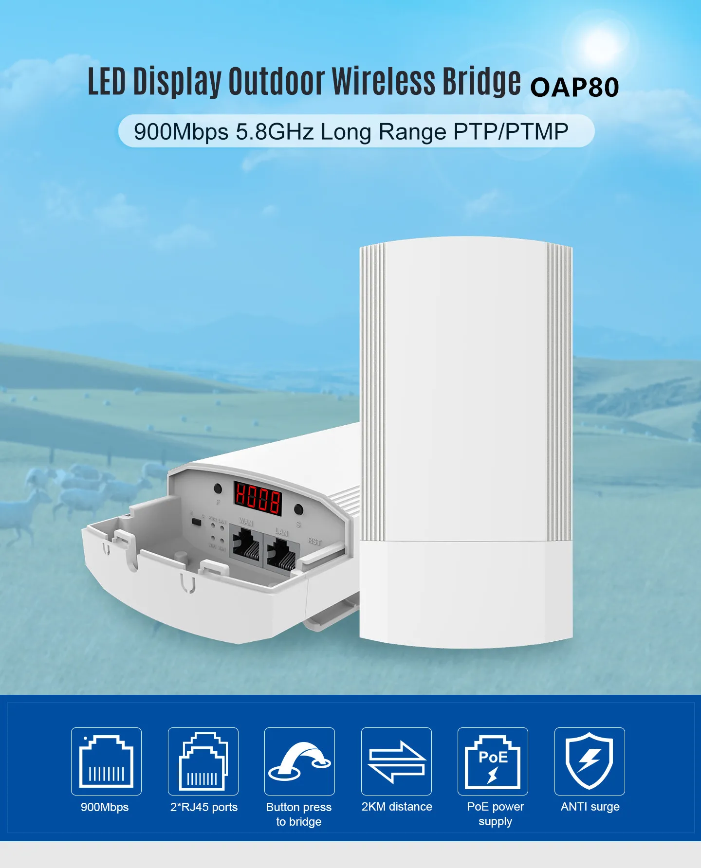 450 Мбит/с 5G высокая мощность открытый CPE беспроводной мост С светодиодный дисплеем, чтобы показать Master/Slave 5,8 ГГц 450 Мбит/с 1 ~ 2 км Расстояние (* PTP *, нет большого барьера) Поддержка Super-WDS и PoE Описание продукта OAP80 является 11ac 5G Открытый CPE с светодиодный-дисплеем. Соответствует стандарту Wi-Fi 802.11ac, скорость передачи данных до 450 Мбит/с, встроенная панельная антенна 8dBi, Диапазон Wi-Fi до 1000 ~ 2000 метров. Используется частота 5,8 ГГц, технология wifi нового поколения 11ac, меньше помех, быстрая и стабильная Беспроводная скорость и лучший сигнал. Высокая пропускная способность 450 Мбит/с, обеспечивает высокоскоростную беспроводную передачу. Наслаждайтесь видео с высоким разрешением и высокой скоростью работы. Белый цвет, бесшовное литье под давлением, пыленепроницаемый и водонепроницаемый дизайн, лаконичность и элегантность. С видимым светодиодный дисплеем и функцией автоматического обнаружения силы сигнала для быстрого построения точки в точку и точка в Многоточечное беспроводное соединение. Простая установка и отладка. Экономьте человеческие затраты. Режим работы Super WDS/Gateway/Repeater/WISP/Wireles AP может удовлетворить требования нескольких схем передачи Wi-Fi. Мощность передачи RF регулируется на основе окружающей среды. Отключите радиочастотную мощность с высокой плотностью людей или беспроводным AP, или Увеличьте радиочастотную мощность в большом диапазоне для улучшения производительности. Расстояние PTP/PTMP составляет более 1000 метров, Просто передайте 4K видео лифта на 60 этажах зданий. Специально для передачи видео лифта, принимает частоту 5,8 ГГц, высокоскоростную беспроводную передачу 450 Мбит/с, обеспечивает четкое и плавное отслеживание видео. Особенности продукта 1. 802.11ac/b/g/n Поддержка 2. Встроенная двойная поляризационная антенна MIMO 11dBi 3. Регулируемая мощность передачи от 0 до 24 дБм/1000 мВт 4. AP/беспроводной клиент/повторитель/WDS / WISP режимы работы 5. Наружный стабилизированный корпус с IP65 водонепроницаемым 6. Пассивный PoE поддерживает до 60 метров (200 футов) 7. Расширьте охват вашей существующей сети компании на другое здание 8. Быстрая и простая Настройка с помощью веб-утилиты управления Посылка OAP80 Руководство пользователя на английском языке Кабель Ethernet Стяжки из нержавеющей стали Адаптер питания PoE