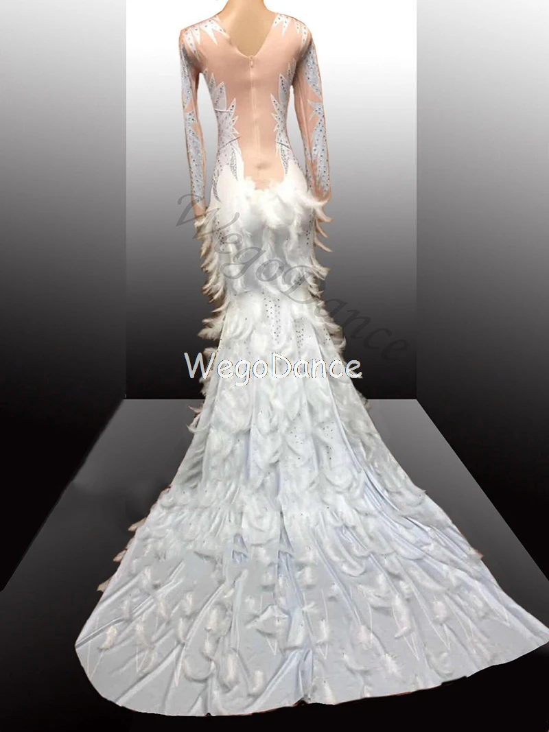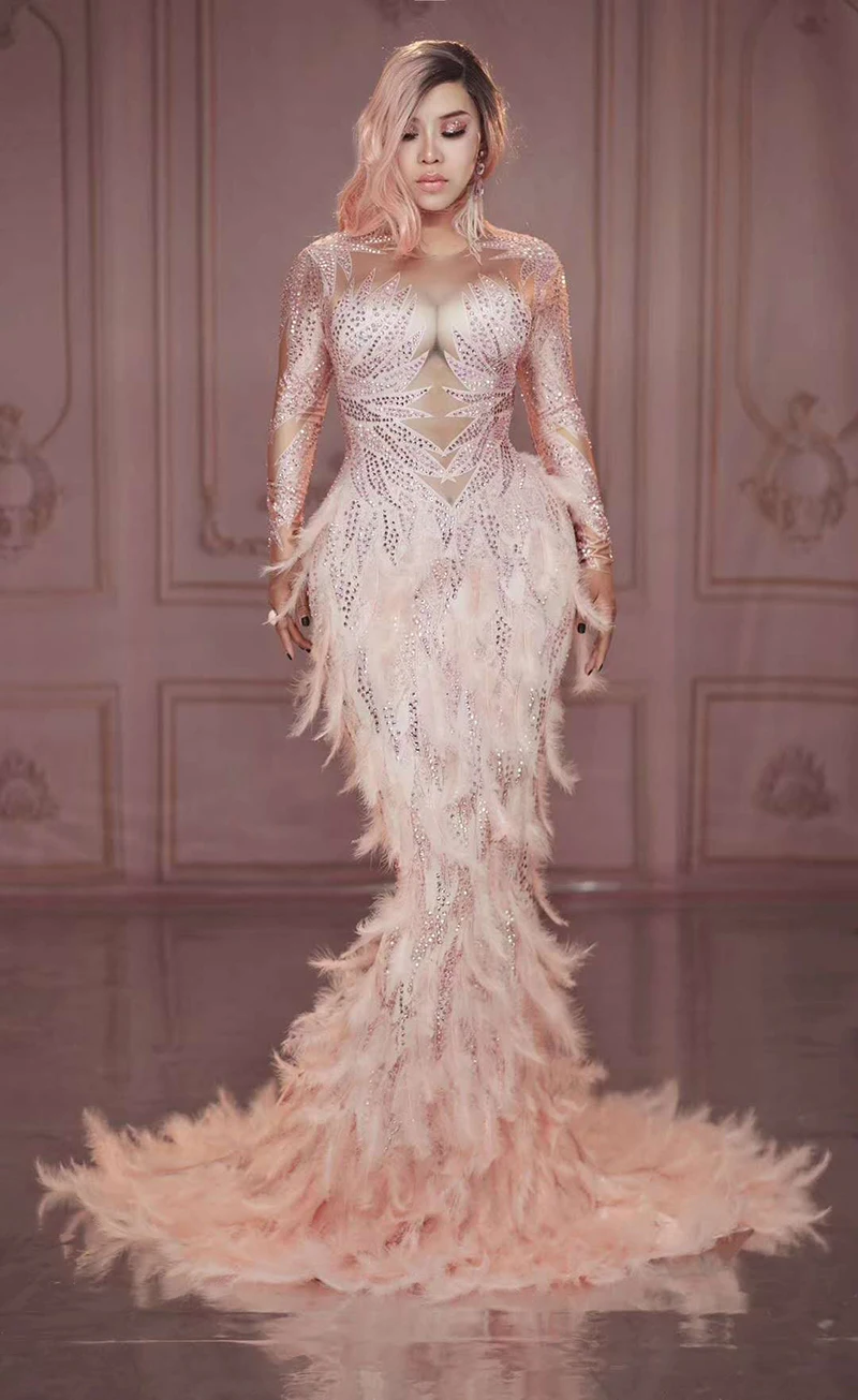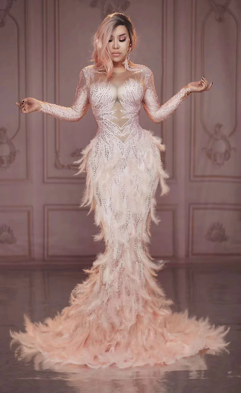 Модное блестящее розовое платье телесного цвета с перьями, стразы, сексуальное длинное платье с большим хвостом, костюм для выпускного вечера, дня рождения, праздника