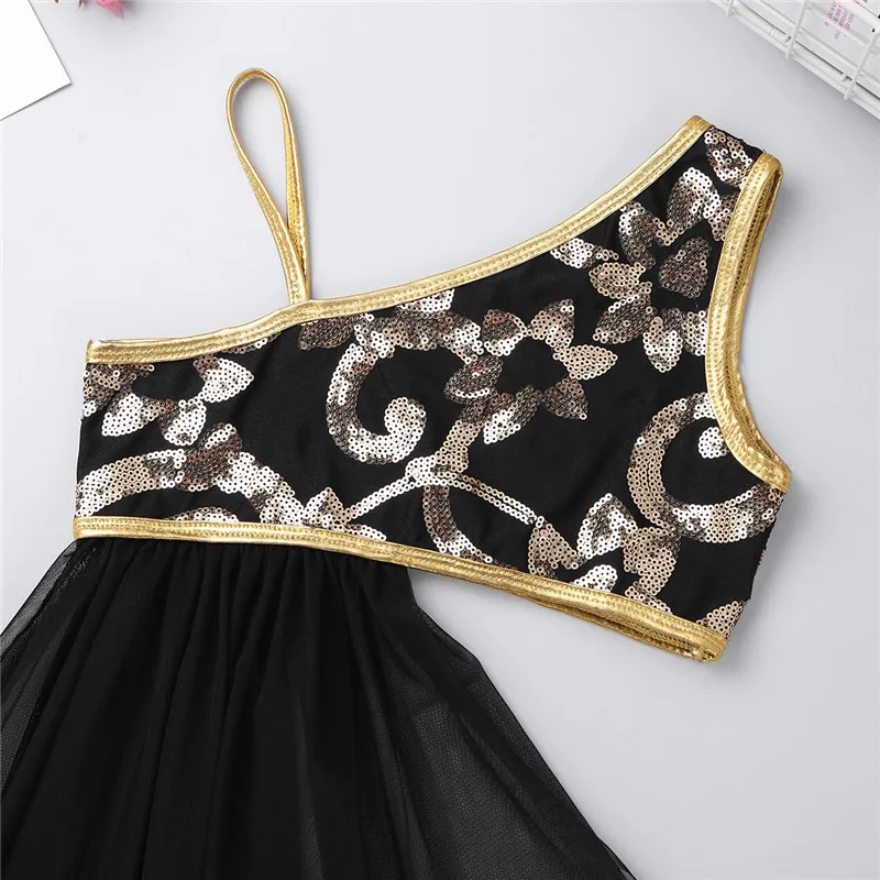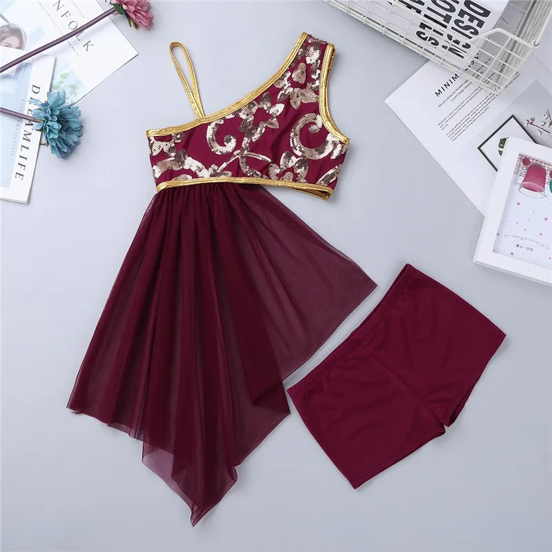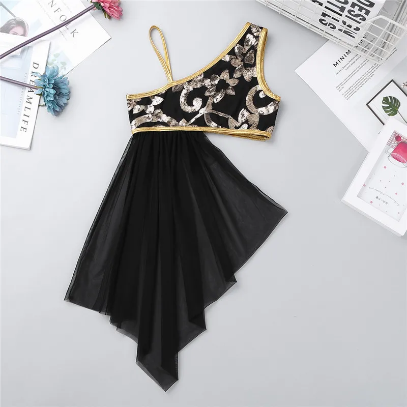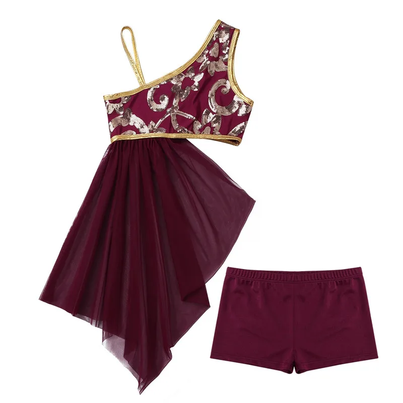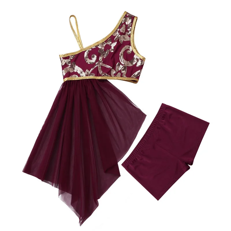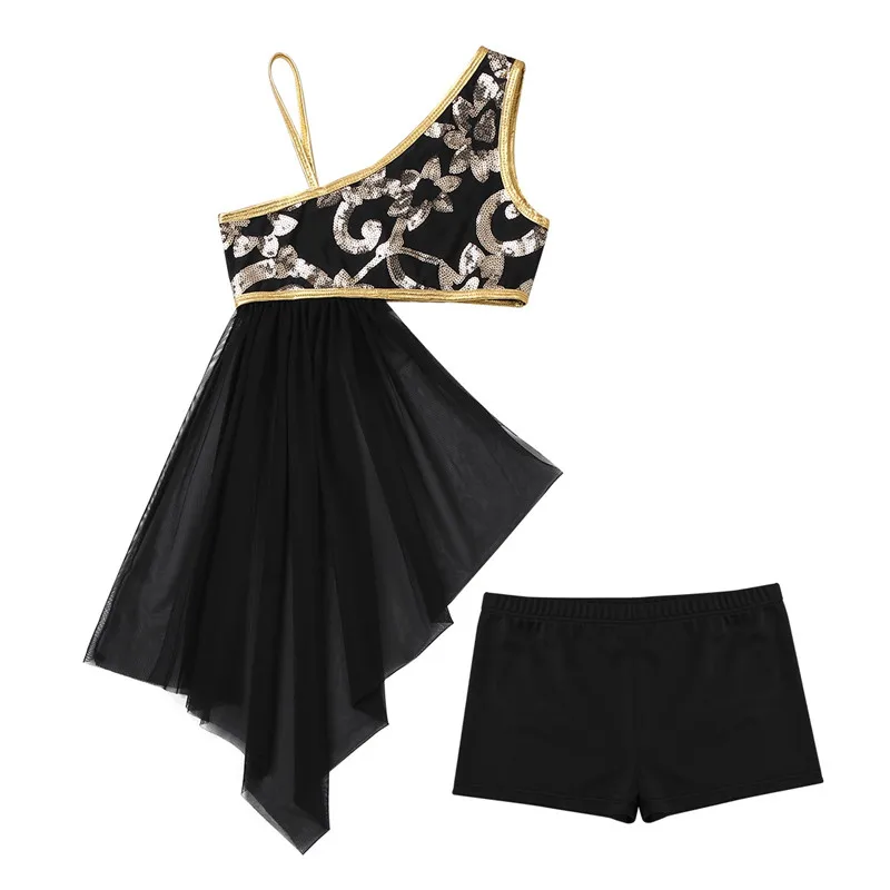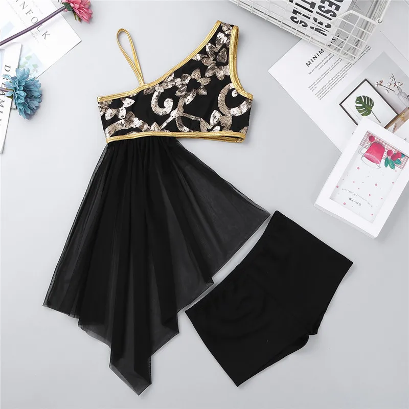 Комплект из 2 предметов для маленьких девочек, топ с цветочным принтом и пайетками, юбка с открытой талией и низом, современный Лирический комплект для танцев