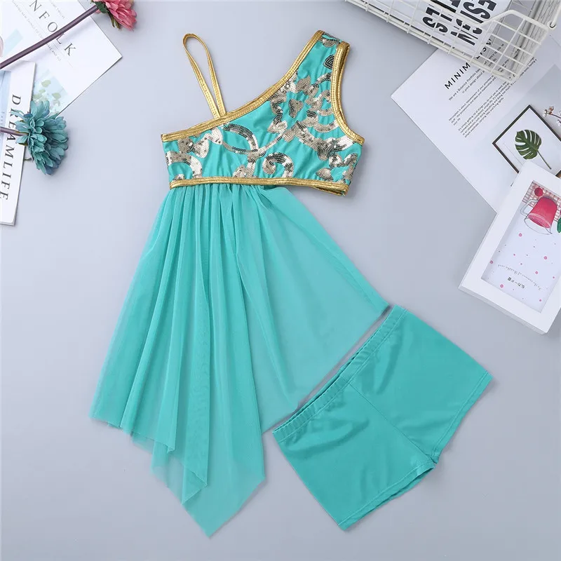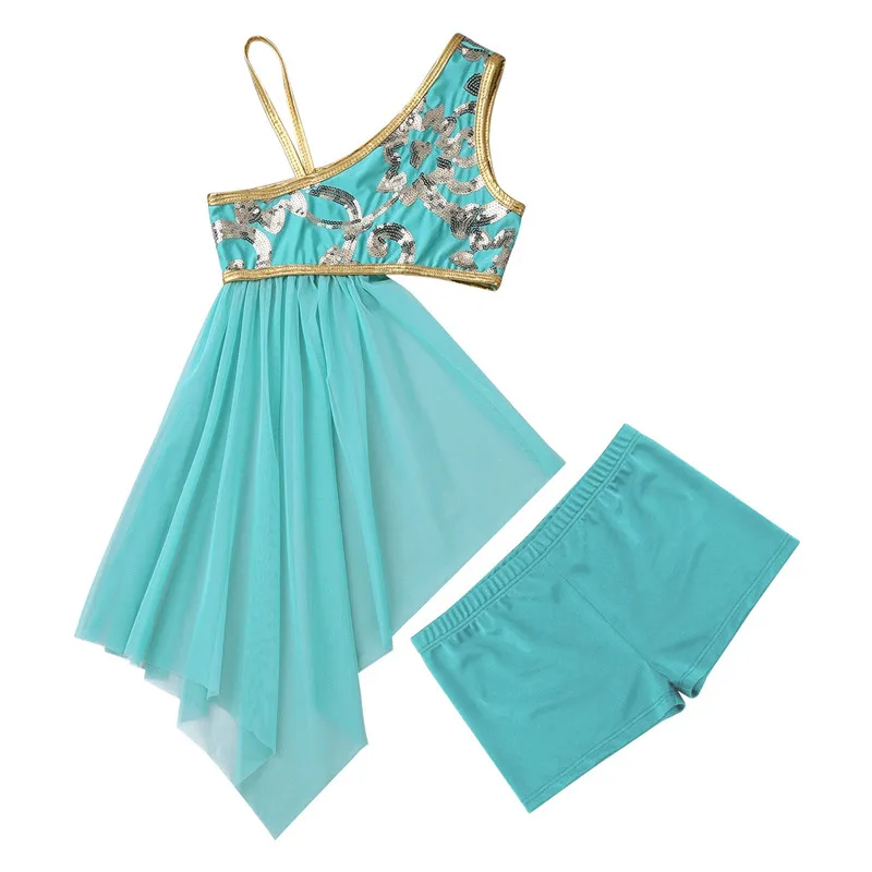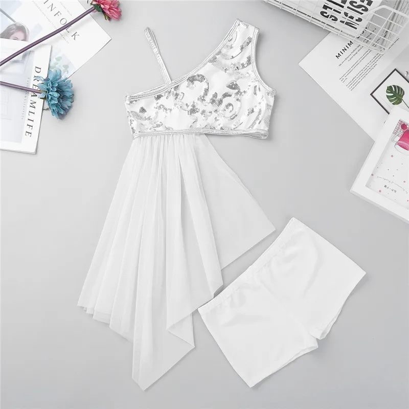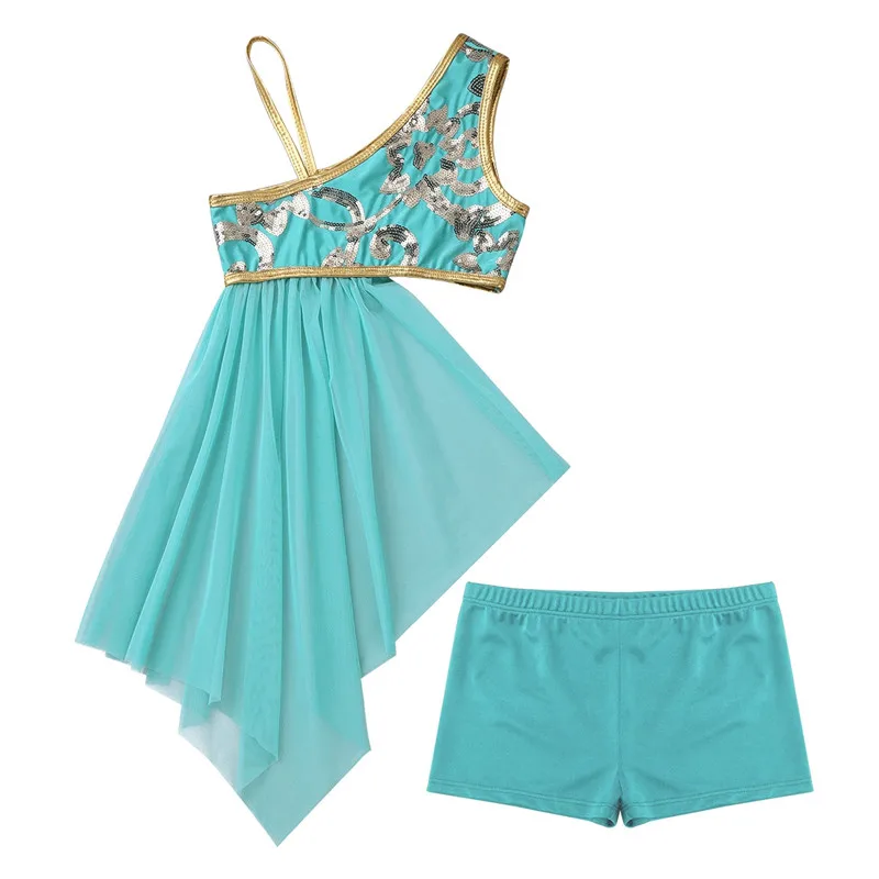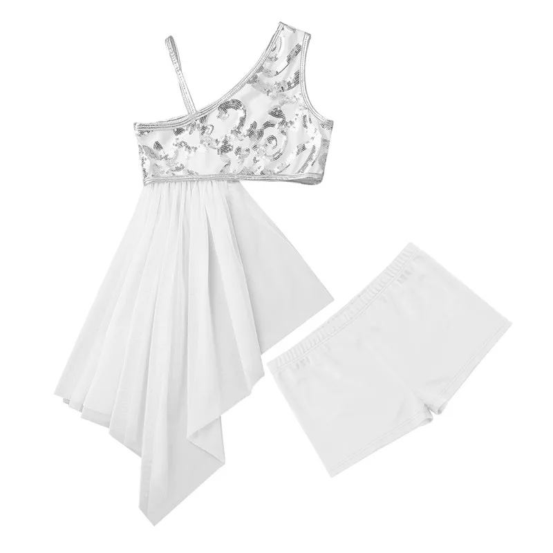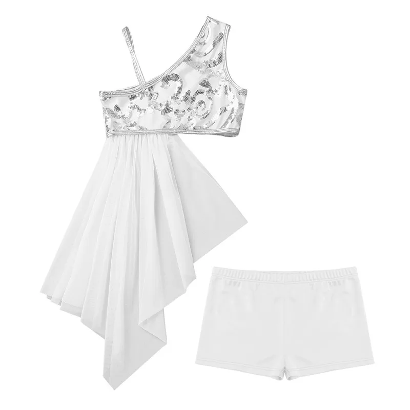 Сетчатая юбка с вырезами по бокам и высокой талией. Подходящие брюки с эластичным поясом. Красивый танцевальный костюм для вашей девочки.