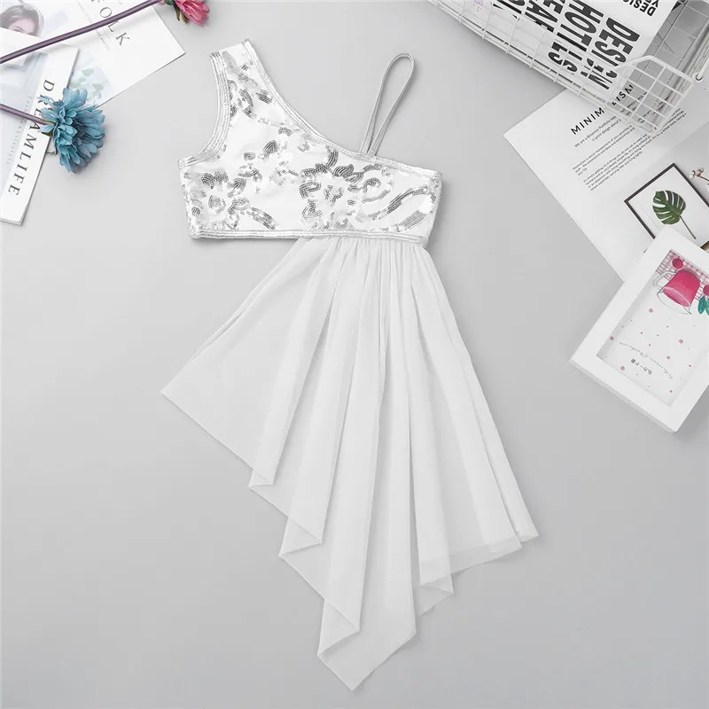 Одно плечо и один ремешок на тонких бретельках, диагональный вырез, Лиф украшен блестящими цветочными блестками.