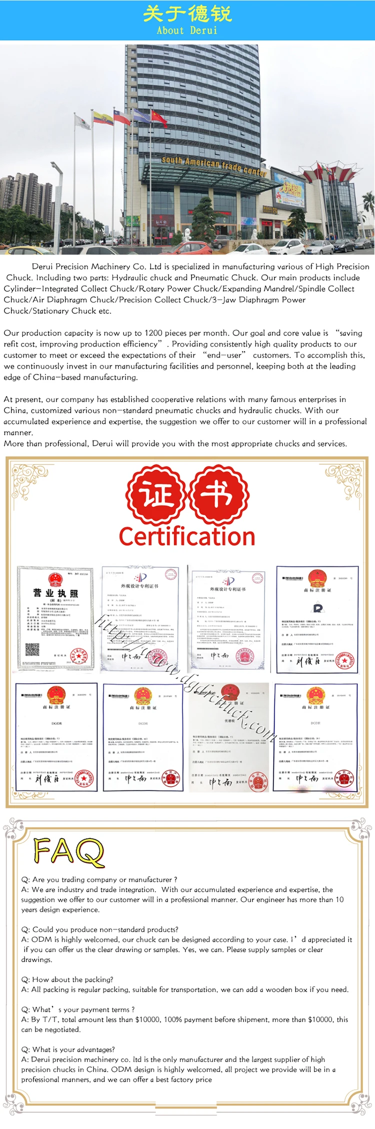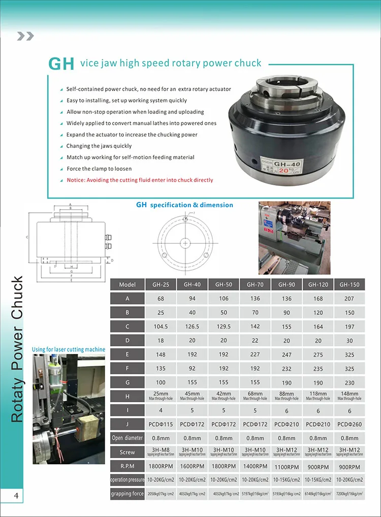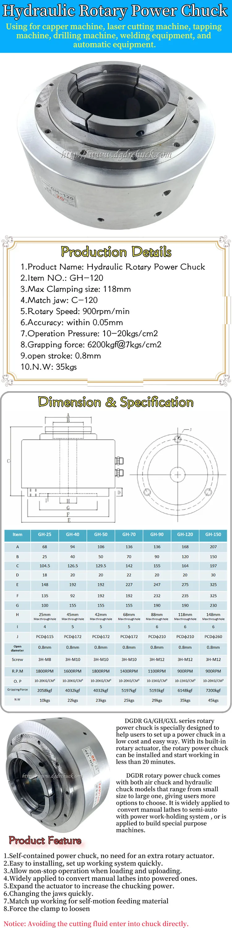 1. Автономный патрон питания, нет необходимости в дополнительном поворотном приводе. 2. Простая установка, быстрая настройка рабочей системы. 3. Возможность бесперебойной работы при загрузке и загрузке. 4. Широко применяется для преобразования ручных токарных станков в мощные. 5. Расширьте привод, чтобы увеличить мощность патрона. 6. Быстро меняйте челюсти. 7. Подходит для самостоятельной подачи материала 8. Подсоедините зажим к ослаблению Примечание: Избегайте попадания режущей жидкости непосредственно в патрон. Раньше он был сложным для пользователей, чтобы преобразовать ручной токарный станок в приведенный в действие с блоком питания работы, так как Настройка гидравлической системы является довольно неприятным-некоторые. Поворотный патрон серии DGDR GA специально разработан, чтобы помочь пользователям настроить патрон питания по низкой цене и простым способом. Со встроенным роторным приводом, роторный патрон может быть установлен и начать работать менее чем за 20 минут. DGDR роторный патрон питания поставляется как с воздушным патроном, так и с гидравлическими патронами, которые варьируются от маленького размера до большого, что дает пользователям больше возможностей на выбор. Он широко применяется для преобразования ручных токарных станков в полуавтоматический с системой электропитания или применяется для создания машин специального назначения.