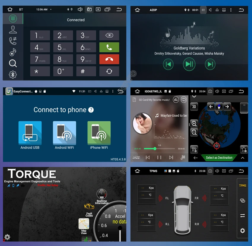 Используя приложение Easy-Connect, через USB-кабель для зарядки и Bluetooth, вы можете отображать дисплей телефона android, например главное меню, фотографии/видео, онлайн-карты навигации. Также вы можете управлять телефоном Android на данном блоке. Поддерживает большинство телефонов Android.