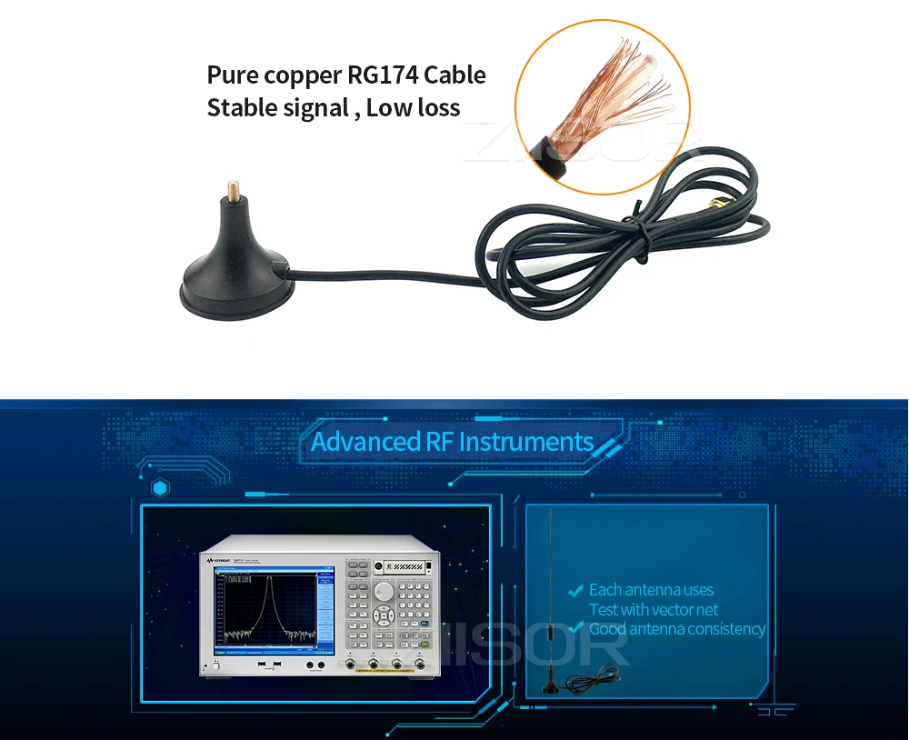 О нас: Chengdu Ziisor Technology Co., Ltd. Мы-технологическая компания, которая специализируется на НИОКР и производстве антенн. Мы имеем профессиональную R & D команду и техническую прочность. Наши антенны имеют надежное качество и производительность. Если у вас есть проблемы с использованием антенны или вам нужны спецификации антенны, вы можете связаться с нами в любое время: Поддержка @ ziisor.com Материал: углеродистая сталь + ABS Материал радиатора: медь Тип соединителя: SMA-J Цвет: черный Высота антенны: 288 мм Диаметр присоски: 30 мм Длина кабеля: 1 м/2 м/3 м/5 м Материал кабеля: RG174 Частота: 2G/3G/GSM/GPRS/NB-IoT Максимальное усиление: 5.5dBi (фактические данные теста) Тип излучения: всенаправленный Поляризация: вертикальная Номинальное сопротивление: 50 Ом Максимальная входная мощность: 50 Вт S.W.R. : ≤ 2 Применение: модуль 2G/ GPRS/NB-LOT/DTU/роутер/умный счетчик для чтения/зарядки/торговый автомат и т. д./усилитель сигнала GSM