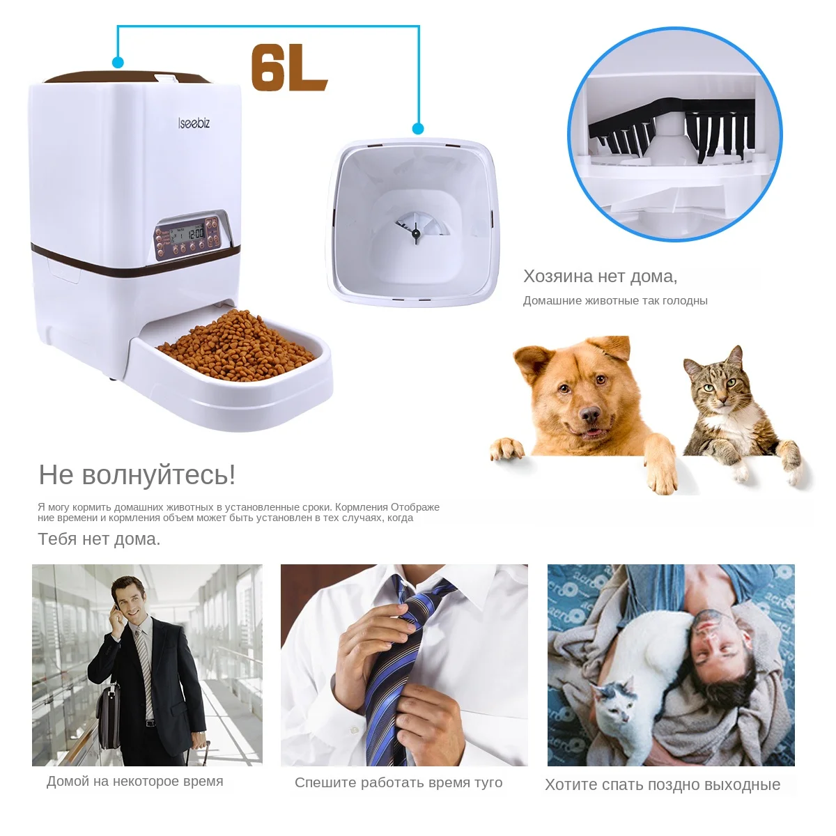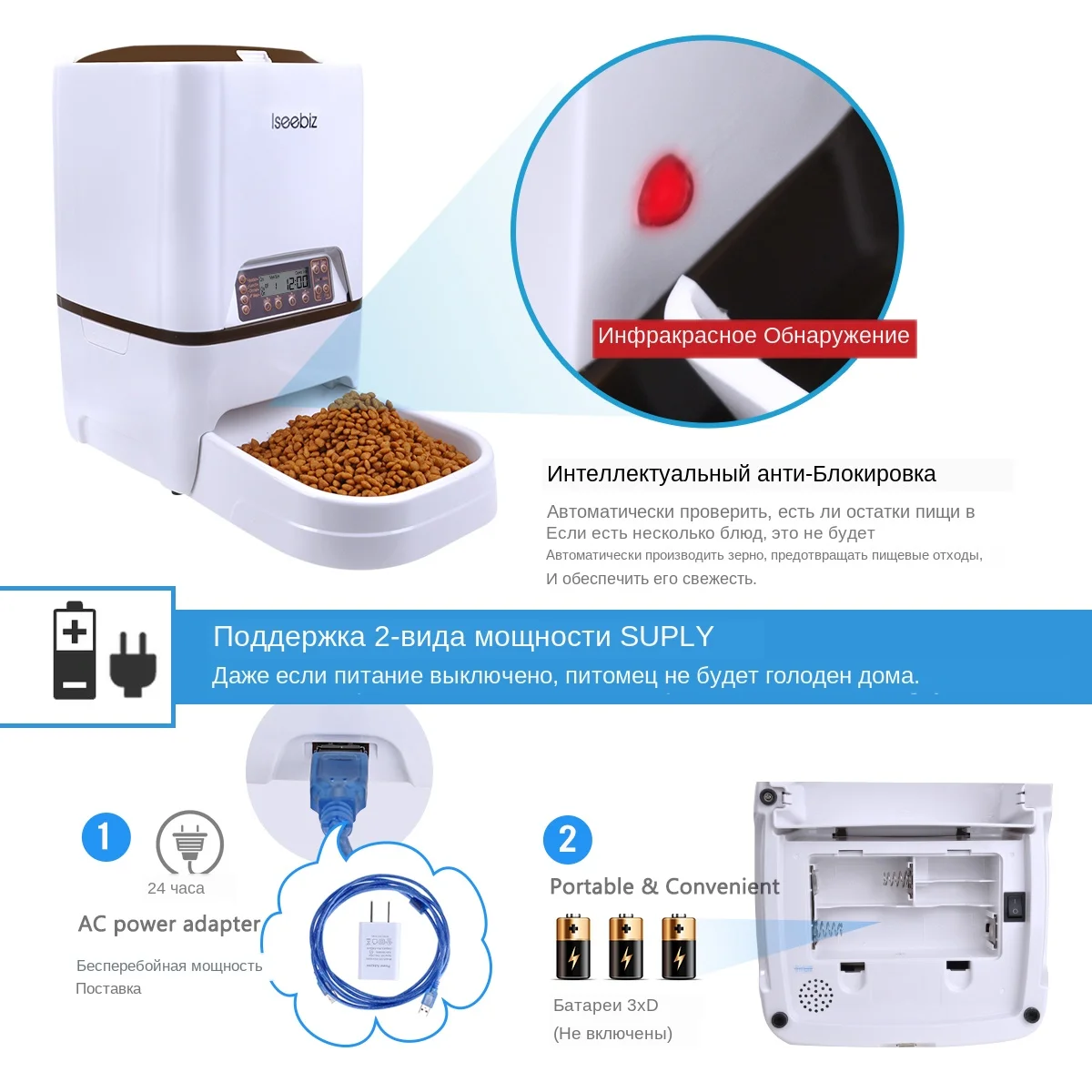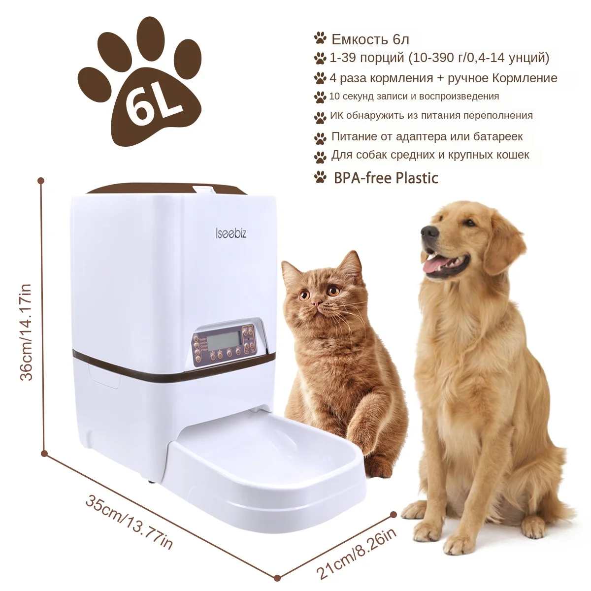 Материал: высококачественный АБС, экологически чистый Вход: от 100 до 240 В переменного тока Выход: 5 В/0,2 А Ёмкость: 6L; Время кормления: 4 приема пищи (завтрак, запуск, ужин и 4 приема пищи); Порционный контроль: 1-39 Порционный контроль; Запись голоса: 10 секунд; Источник питания: Аккумуляторы или адаптер; Инфракрасная индукция: для предотвращения проливания пищи или варенья; Программируемый Таймер: кормление вашего питомца по расписанию и сохранение здоровья вашего питомца; Размеры посылка: 29,52*17*20,47 дюйма (75*43,5*52 см); Размеры изделия: 8,26*13,77*14 дюймов (21*35*36 см); Вес: 4,62 фунтов (2,1 кг);