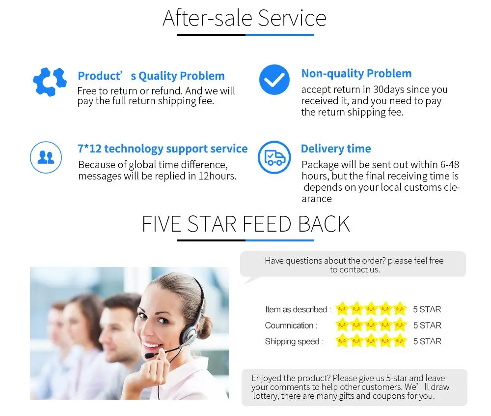 1. Проблема качества товара: бесплатно вернуть или вернуть деньги. И мы оплатим полную стоимость обратной доставки. 2. Проблема некачества: принимаем возврат в течение 30 дней с момента получения, и вам нужно оплатить стоимость обратной доставки. 3,7*12 служба технической поддержки. Из-за разницы во времени на сообщения будет отвечено в течение 12 часов.
