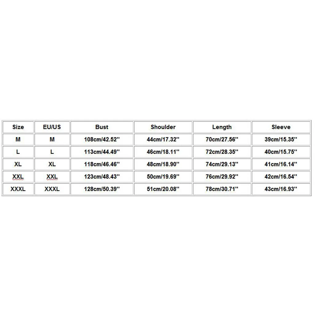 Что вы получаете: 1 x мужские рубашкиРазмер ЕС/США Бюст Плечо Длина Рукав М М 108 см/42,52'' 44 см/17,32'' 70 см/27,56'' 39 см/15,35'' L L 113 см/44,49'' 46 см/18,11'' 72 см/28,35'' 40 см/15,75'' XL XL 118 см/46,46'' 48 см/18,90'' 74 см/29,13'' 41 см/16,14'' XXL XXL 123 см/48,43'' 50 см/19,69'' 76 см/29,92'' 42 см/16,54'' XХХL XХХL 128 см/50,39'' 51 см/20,08'' 78 см/30,71'' 43 см/16,93''