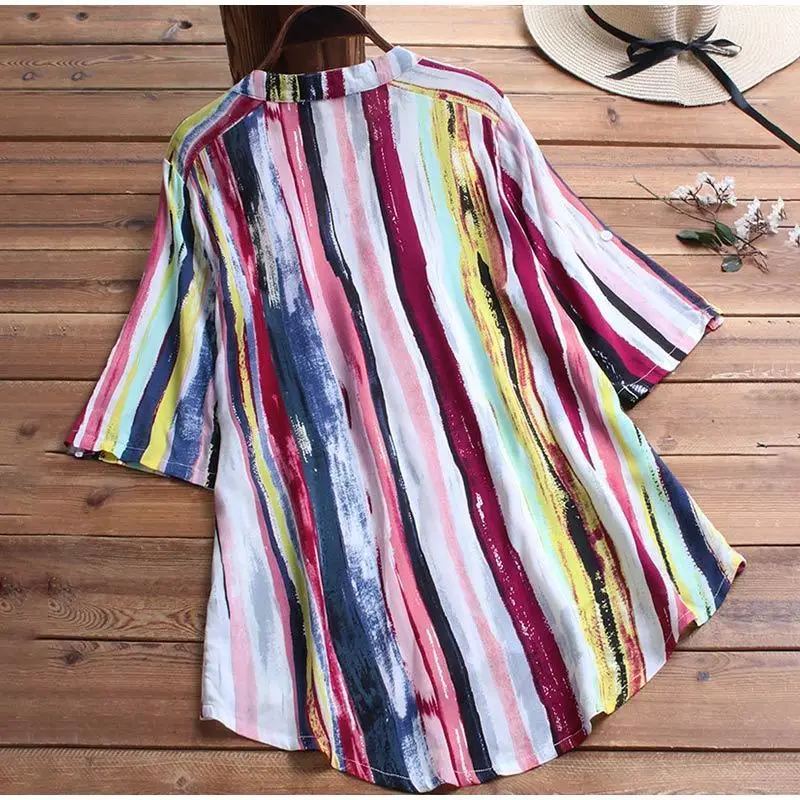 Женская туника с масляным принтом, v-образный вырез, рукав средней длины, оборки, в полоску, на пуговицах, большие размеры, топы, лето 2019