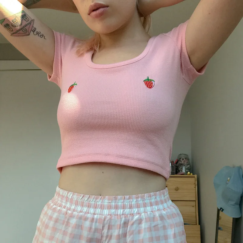 Женский розовый укороченный топ с принтом клубники, вязаные футболки с коротким рукавом, укороченные топы, модные облегающие брендовые топы, новинка 2019