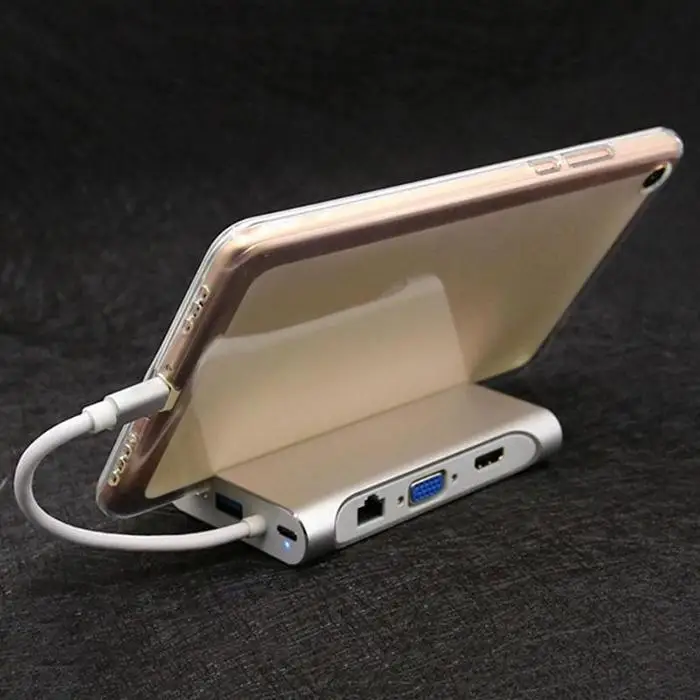 Multi-function dock with HD Multimedia Interfaceport, three USB 3.0 A-type ports, one ultra-fast Gigabit Ethernet port, one VGA port, USB-C PD charging port