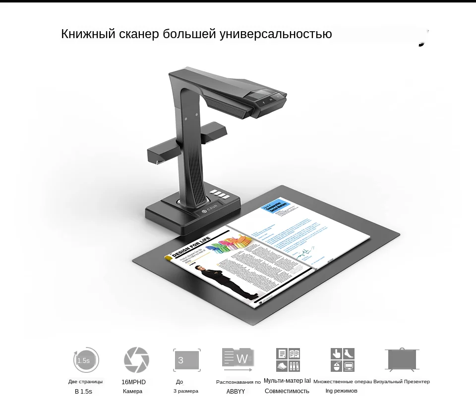 Спецификация: ● Produktart: Смарт-сканер ● Цвет: черный ● Датчик: CMOS ● Пиксель: 18 Mps ● Языки OCR: 180 + ● Вес: 2 кг (нетто) ● Разрешение: 4896*3672 ● USB: высокоскоростной USB 2,0 ● Процессор: 32-битный процессор MIPS ● Поддержка Wi-Fi: полоса 2,4 ГГц ● Формат сканирования: ≤ A3, 420 × 297 мм (16,5 × 11,7 дюйма) ● Скорость сканирования: одноканальная страница 1.5s/страница; Закладка ≥1. 5s/две страницы ● Формат экспорта: JPG/ PDF/ Searchable PDF/ Word/ Excel/ TIFF ● Поддержка системы: XP, Win 7/ 8/10, 32/64 бит; macOS 10,11 и abov Гарантия: один год Pakage список: ● 1x сканер ET18 Pro ● 1x боковые огни ● 1x USB кабель ● 1x адаптер питания ● 1x ручная кнопка ● 1 педаль ● 1x черный блокнот для документов ● 2x специализированные пальчиковые кроватки ● 1x CD ● 1x Руководство пользователя PS: пожалуйста, свяжитесь с нами, чтобы убедиться, что ваши языки в диапазоне CZUR сканера OCR языков