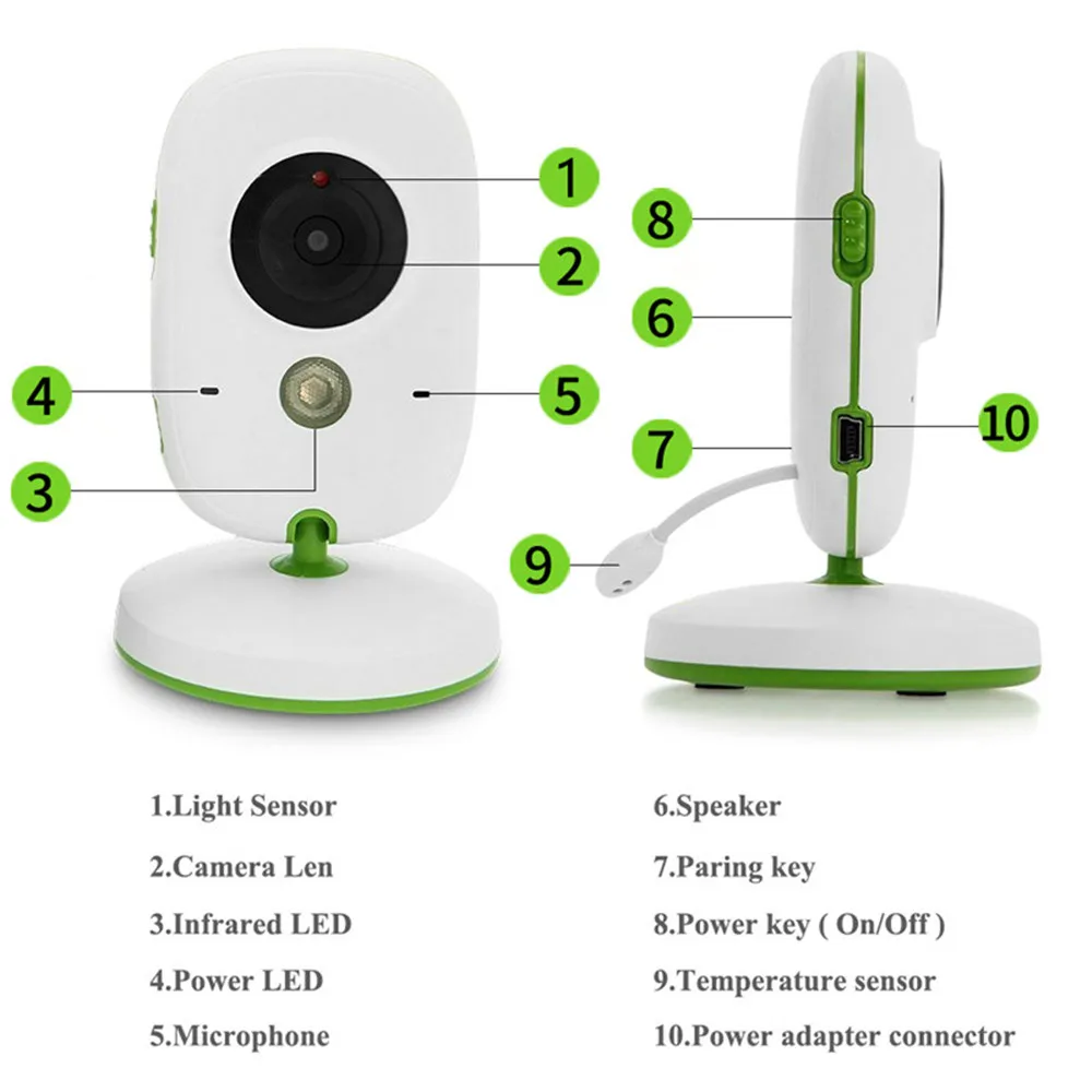 1. Двухстороннее аудио между камерой и монитором, вы можете поговорить с ребенком. 2. Знайте комнатную температуру вашего ребенка весь день, не беспокоясь! 3. Высокая контрастность 2,0 дюймов Цвет ЖК-дисплей монитор 4. Встроенные колыбельные могут помочь родителю утешить ребенка засыпать.