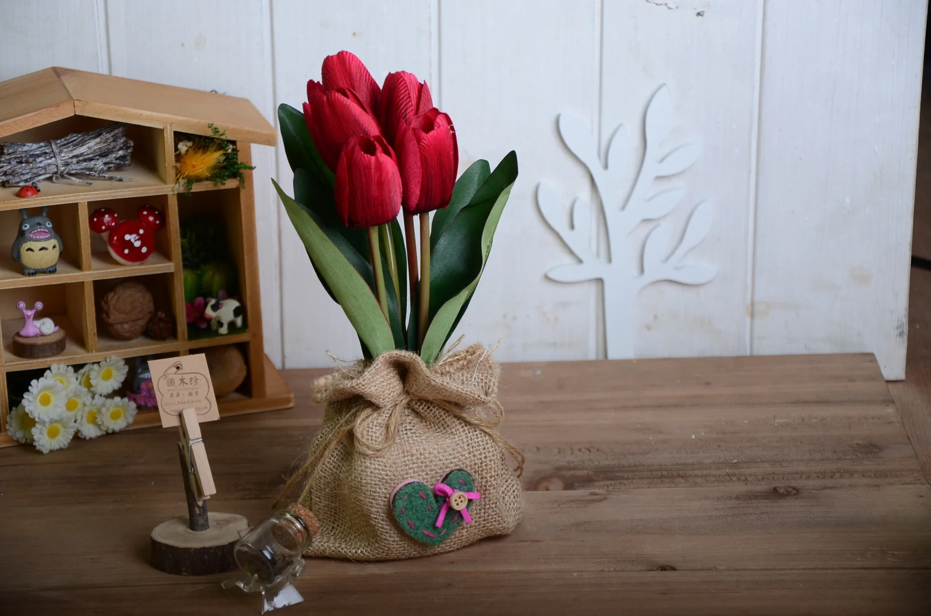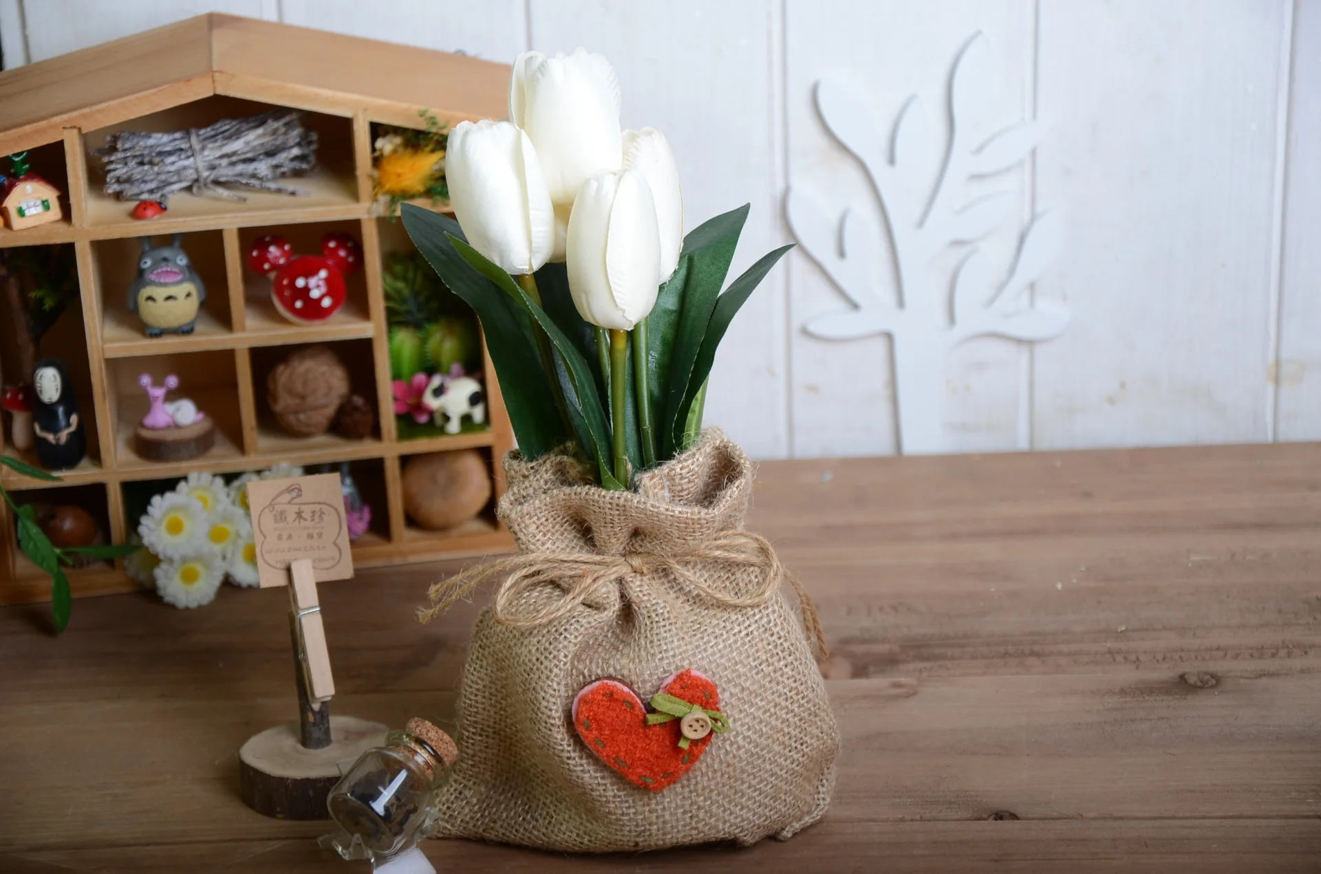 [Посылка]-Каждая посылка состоит из 5 частей, поддельных тюльпанов с украшением мешком, ярких цветов с настоящим прикосновением и букетом высокого качества.