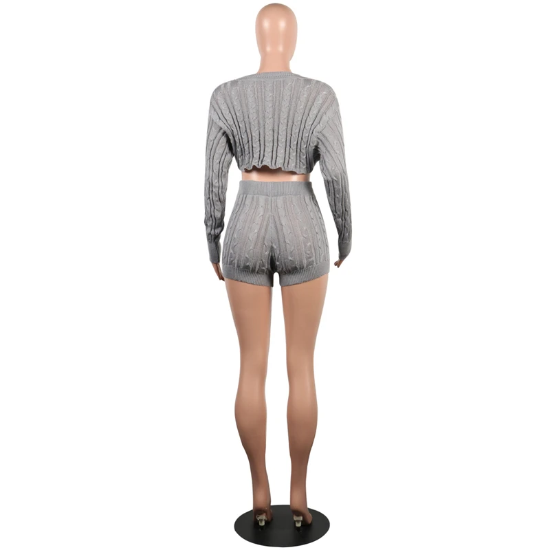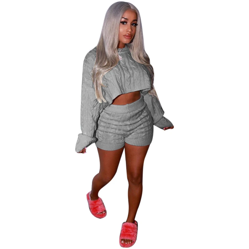 Осенне-зимний комплект из 2 предметов со свитером, женская одежда, Свободный укороченный топ с длинными рукавами и обтягивающие шорты, костюмы, большие размеры, комплекты