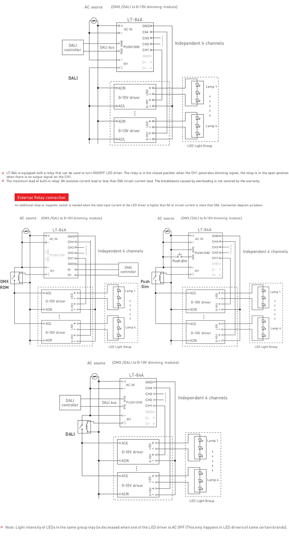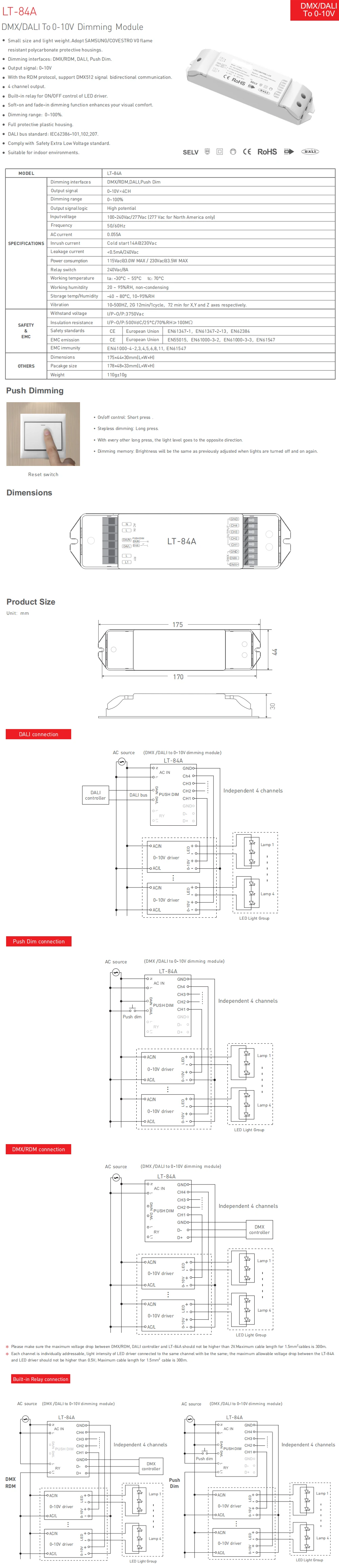 Выходной сигнал: 0-10 вБлагодаря протоколу RDM, Поддержка двунаправленной связи сигнала DMX512.4-канальный выход.Встроенное реле для управления включением светодиодный выключением светодиодного драйвера.Функция мягкого приглушения и затемнения повышает визуальный комфорт.Диапазон затемнения: 0 ~ 100%.Полностью Защитный пластиковый корпус.Стандарт шины DALI: IEC62386-101, 102207.Соответствует стандарту безопасности сверхнизкого напряжения.Подходит для помещений.