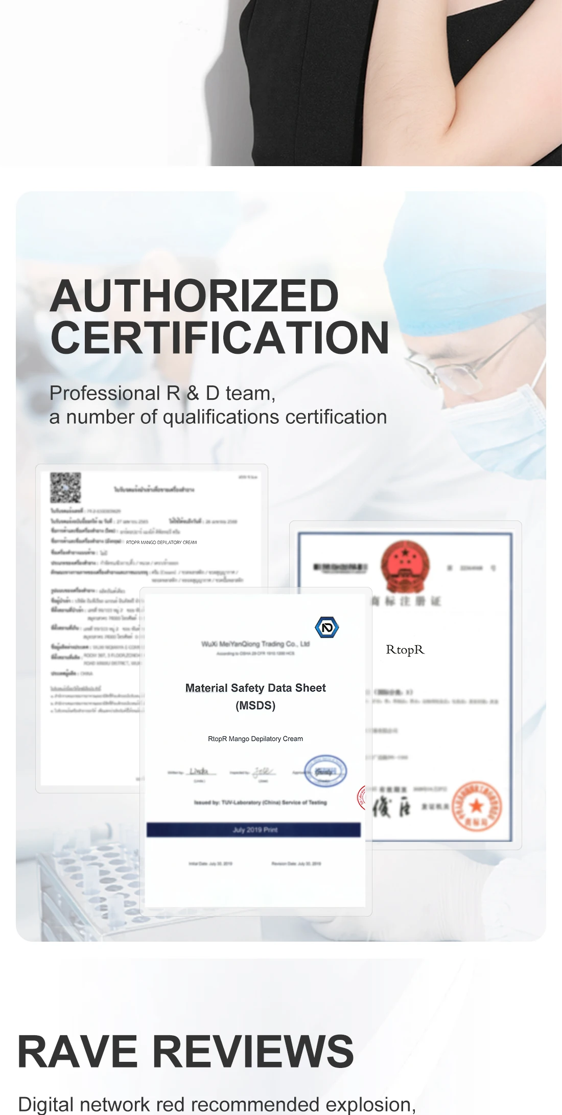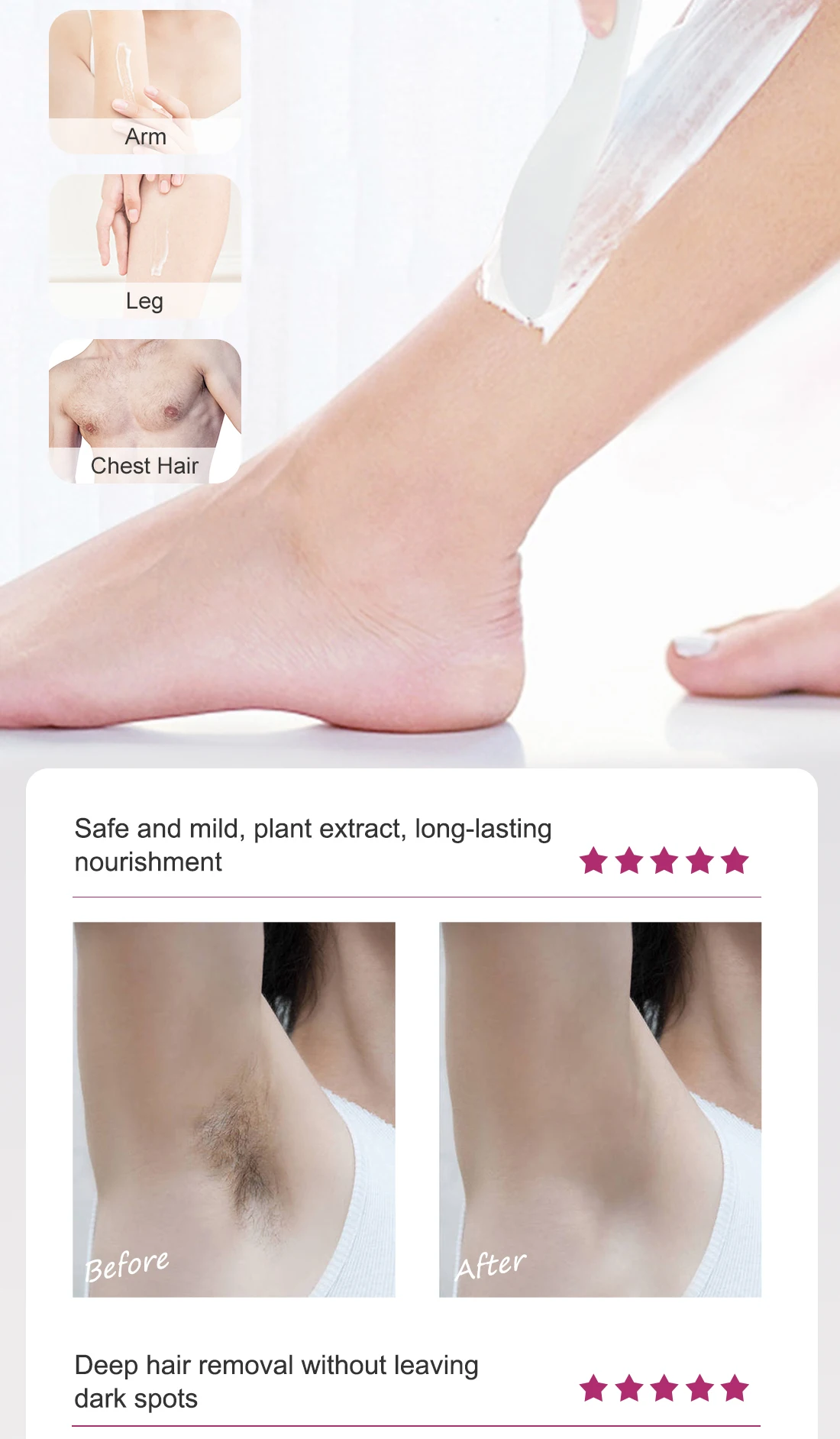 Содержит экстракт манго, в сочетании с улучшенной формулой для удаления волос, не раздражает кожу, она чистая, долговечная, легко удаляет или краску, оставляя кожу гладкой и увлажненной.