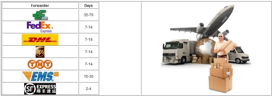 A: Есть 7 судоходную компанию для выбора: DHL, Fedex, UPS, ТНТ, EMS, SF и авиа-отправление Почты Китая. Если посылка весом товаров, общий вес которых не превышает 2 кг и длина коробка короткий, чем 60 см, вы можете выбрать Бесплатная доставка по авиа-отправление Почты Китая.