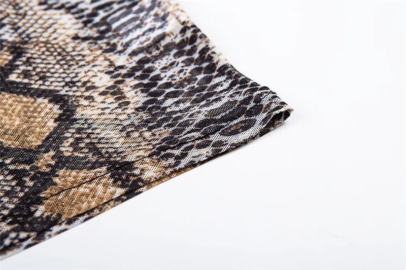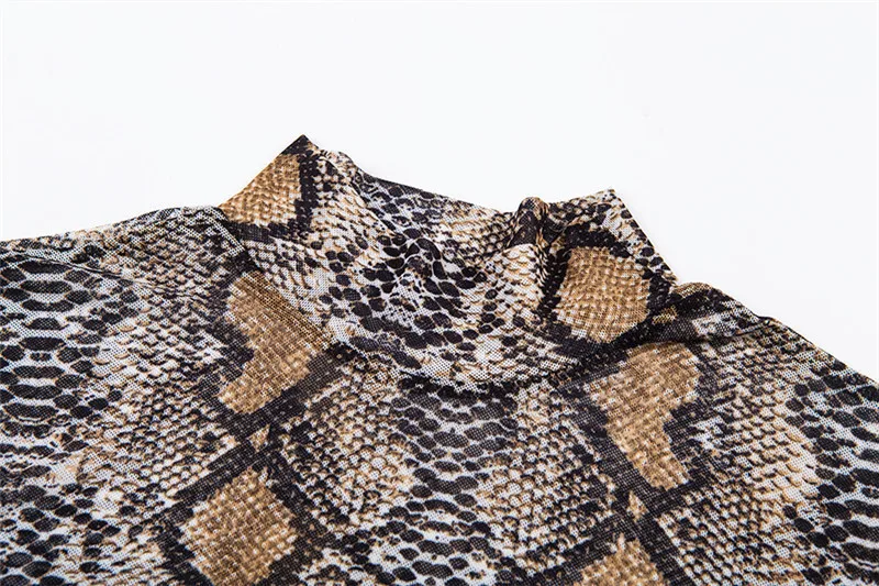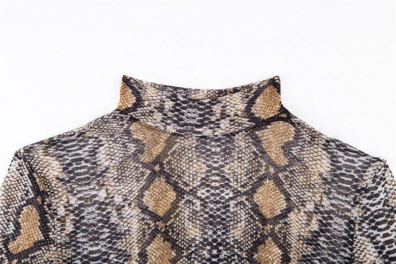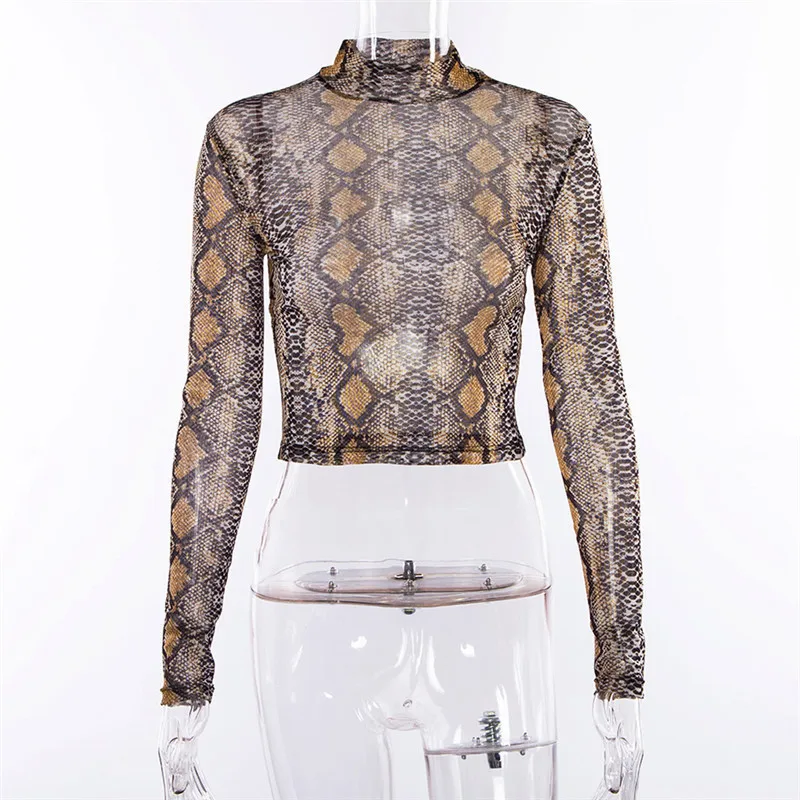 Повседневная зеленая футболка со змеиным принтом, Женский сетчатый топ с длинным рукавом, Прозрачная женская футболка из змеиной кожи, укороченный топ с высоким воротом, GRNSHT