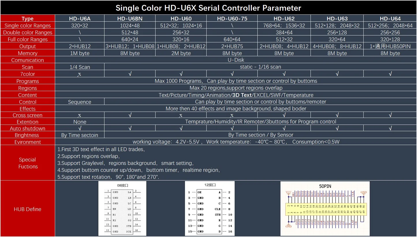 Huidu HD-U6x одноцветный светодиодный контроллер Пять новых технологий Новая технология обновления: двигаться быстрее, частота обновления выше. Более эффектный эффект: 3d-текст с особой формой, анимацией, текстовым и гипертекстовым поддержкой новой границы. Поддержка раздела в реальном времени (вторичная разработка), перегородки могут перекрываться. Максимальная поддержка s до 32 серого уровня, поддержка раздельного фона. Время поддержки, включая время цикла, u-диск также может поддерживать общие смарт-настройки. Поддержка температуры, влажности, яркости, дистанционного управления и т. д. (U6A не поддерживает). Поддержка, в наличии 7 цветов, дисплей, новинка обновленная шестой поколения карты.