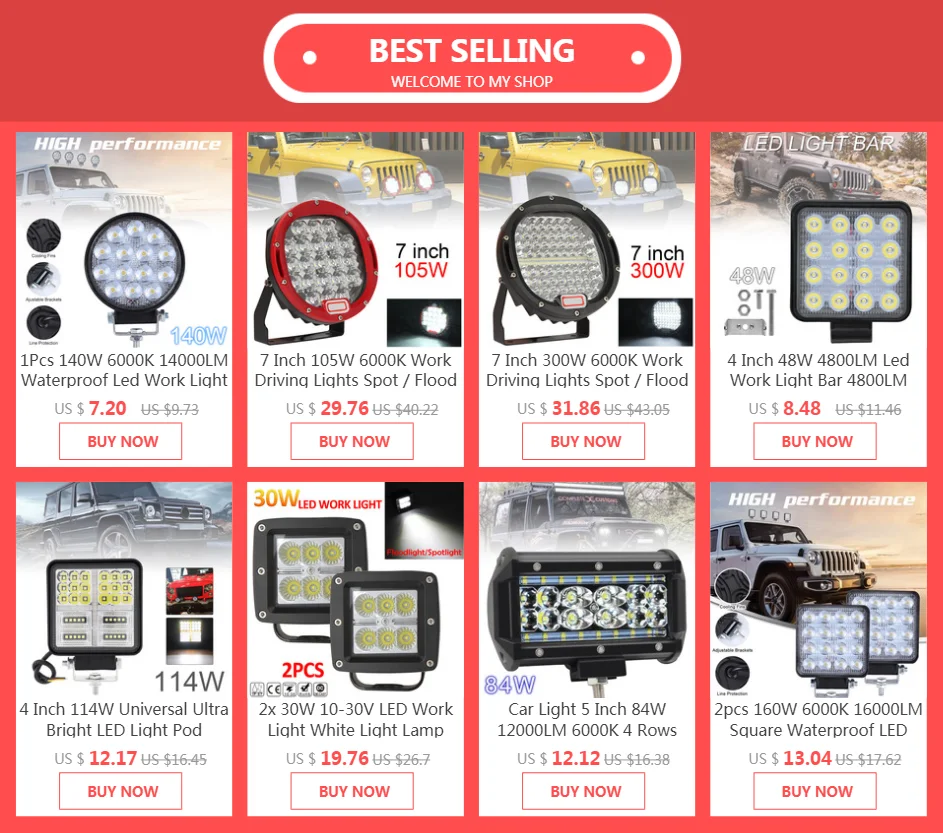 Тип 6: Мощность: 117 Вт Защита от попадания: IP68 Люмен: 11700LM Угол луча: точка Посылка включает в себя: 1 x Внедорожный светодиодный светильник , 1 x светодиодный комплект аксессуаров на рабочий светильник